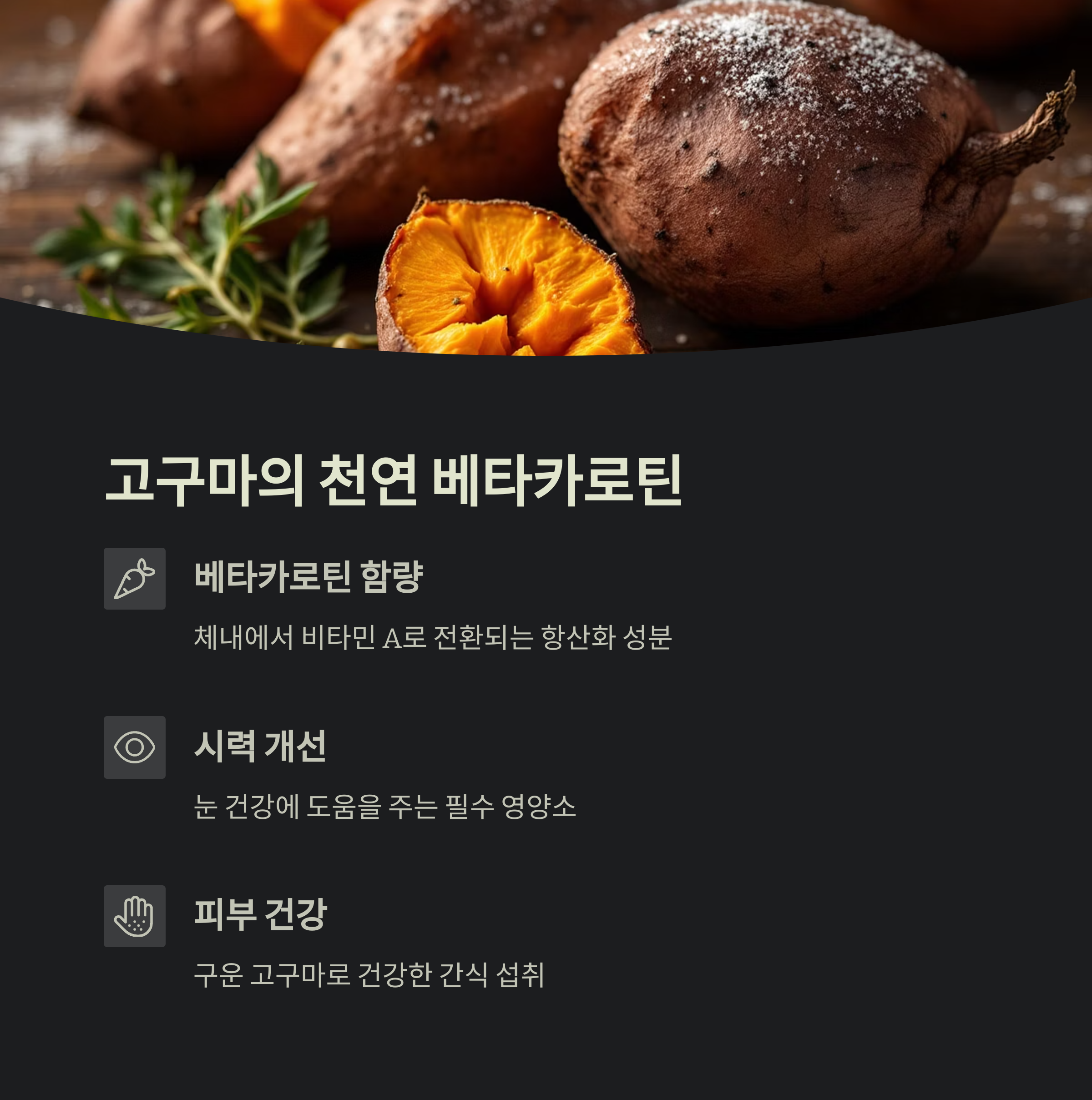 | 고구마 | 베타카로틴 | 피부, 눈 건강 개선 |