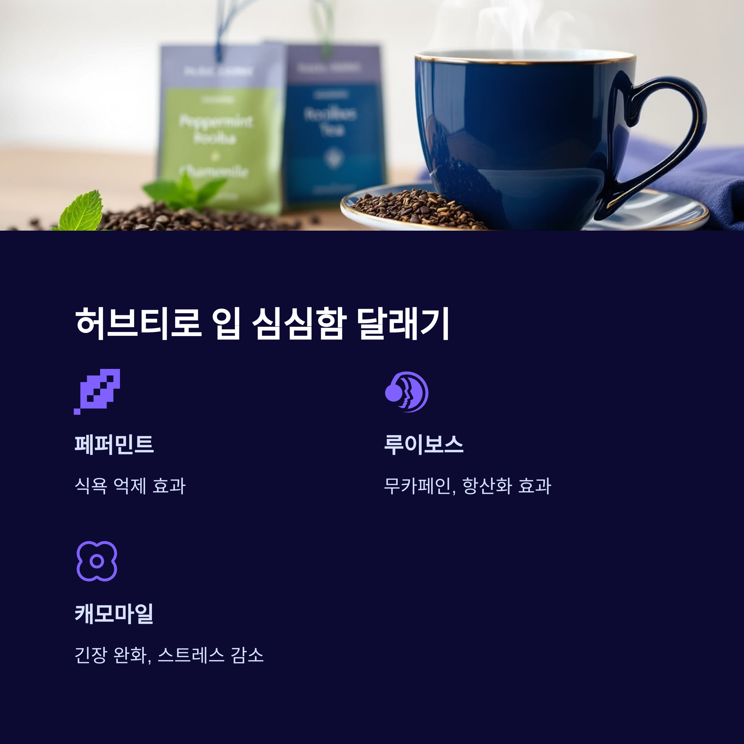 도움이 됩니다. 특히 페퍼민트, 루이보스, 캐모마일은 식욕 억제나 긴장 완화에