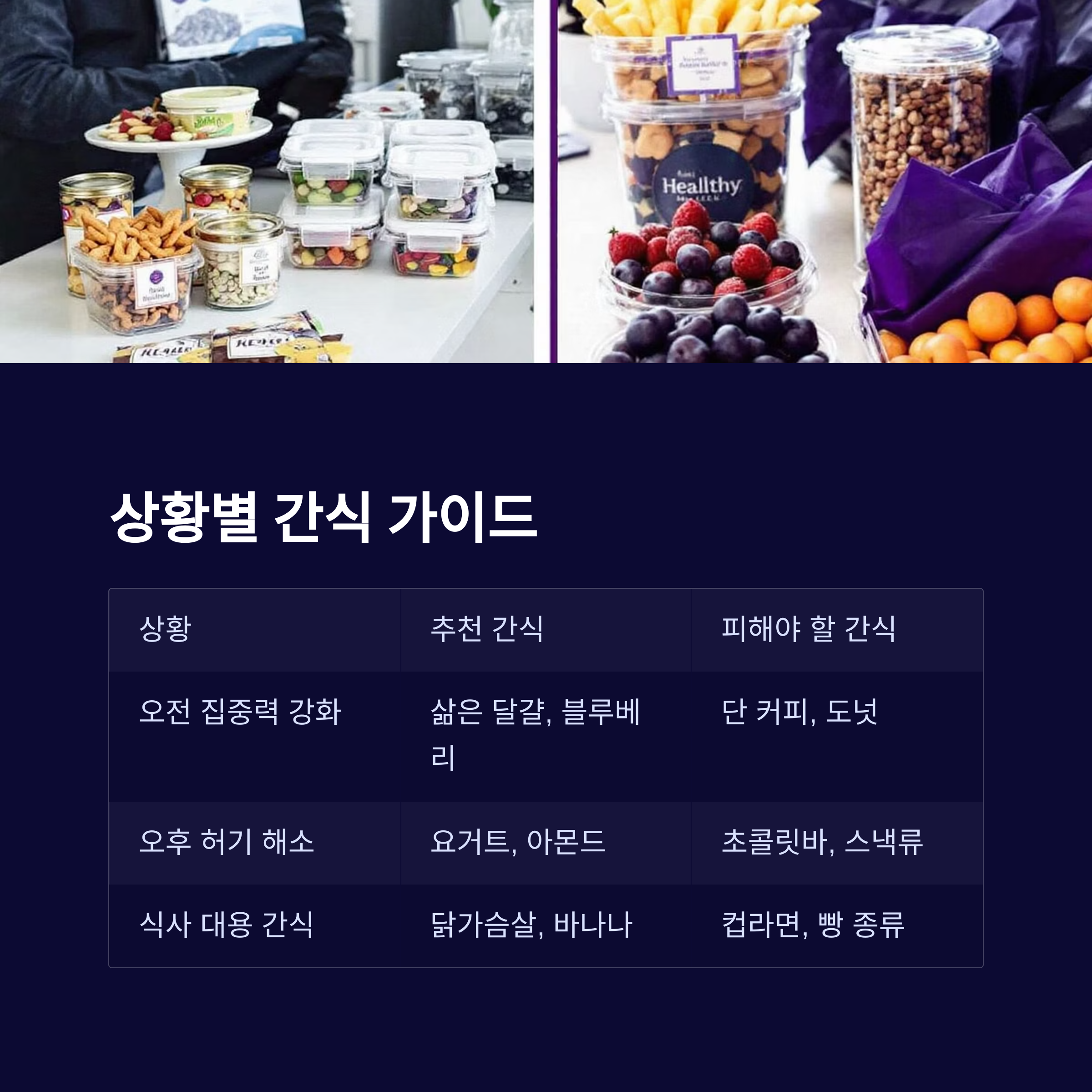 | 오후 허기 해소 | 플레인 요거트, 아몬드 | 초콜릿바, 스낵류 |