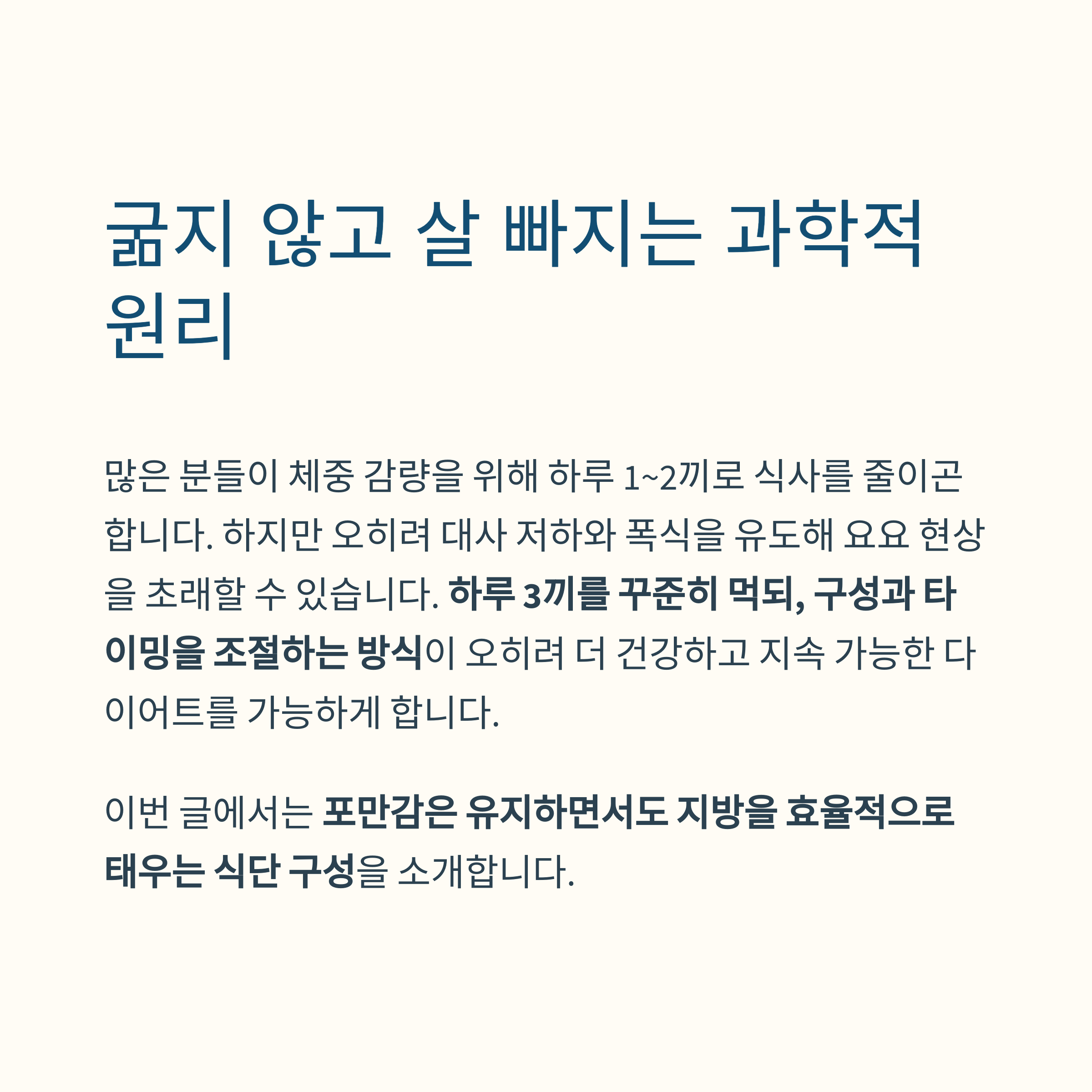 이번 글에서는 포만감은 유지하면서도 지방을 효율적으로 태우는 식단 구성을 소개합니다.