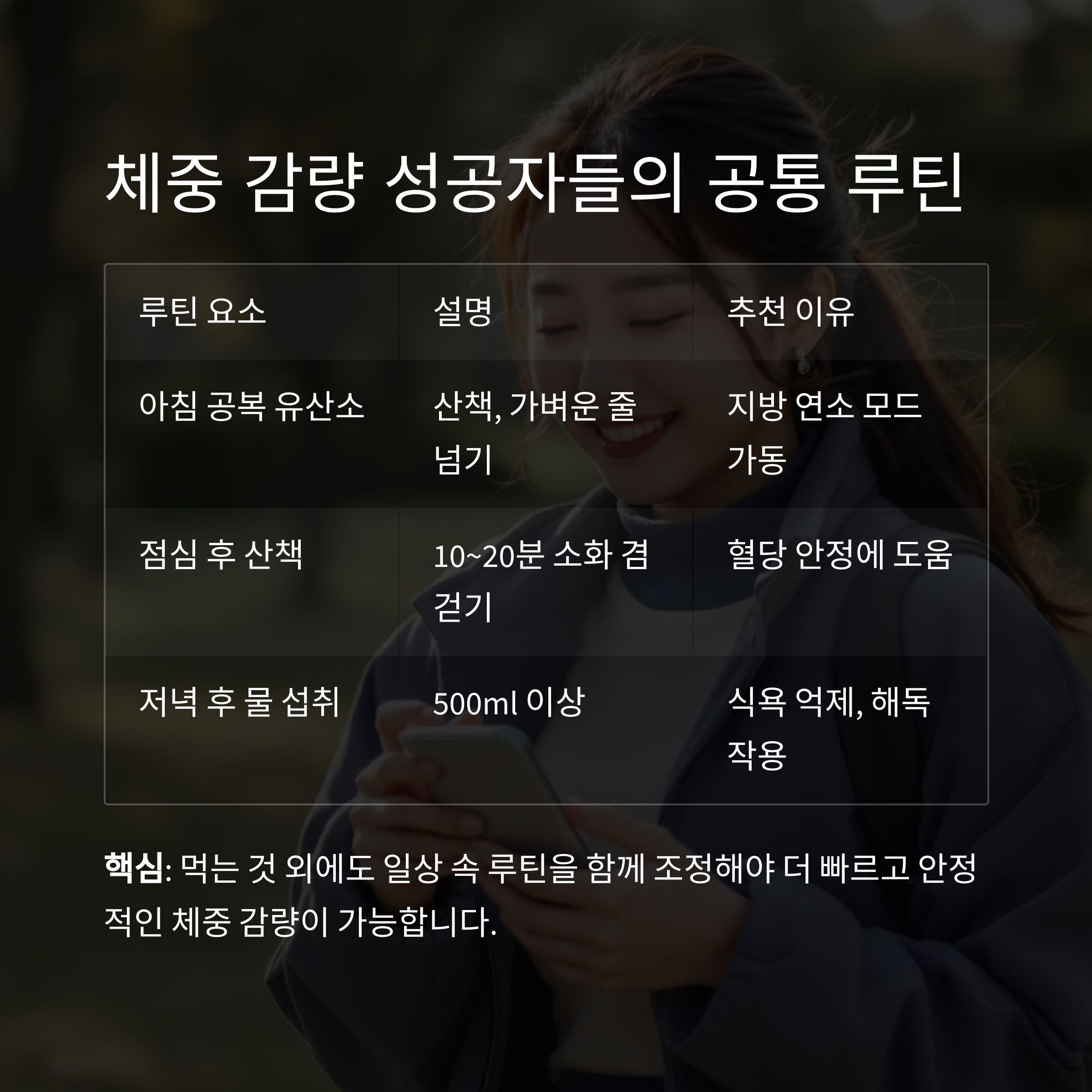 아래는 체중 감량 성공자들이 공통적으로 따르는 루틴입니다.