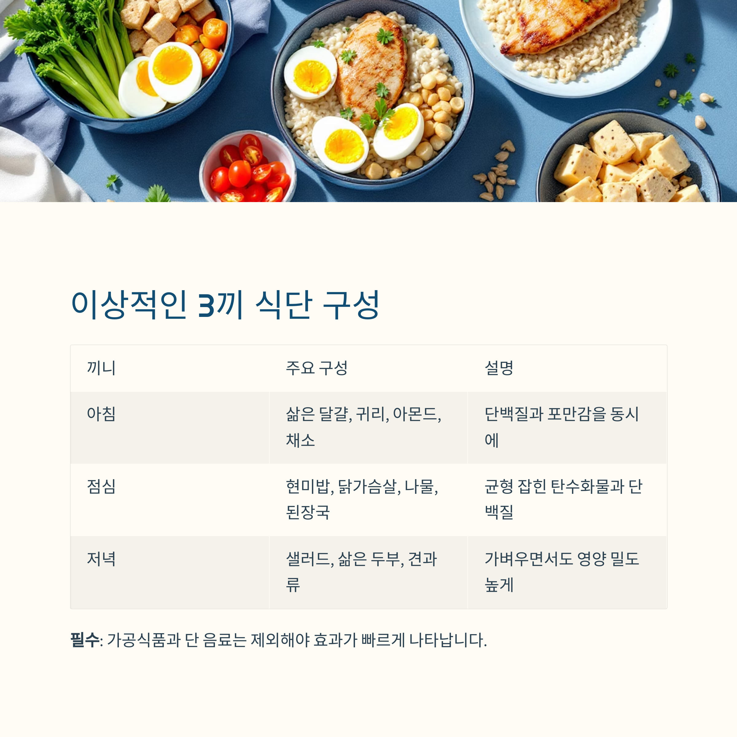 | 아침 | 삶은 달걀, 귀리, 아몬드, 채소 | 단백질과 포만감을 동시에 |