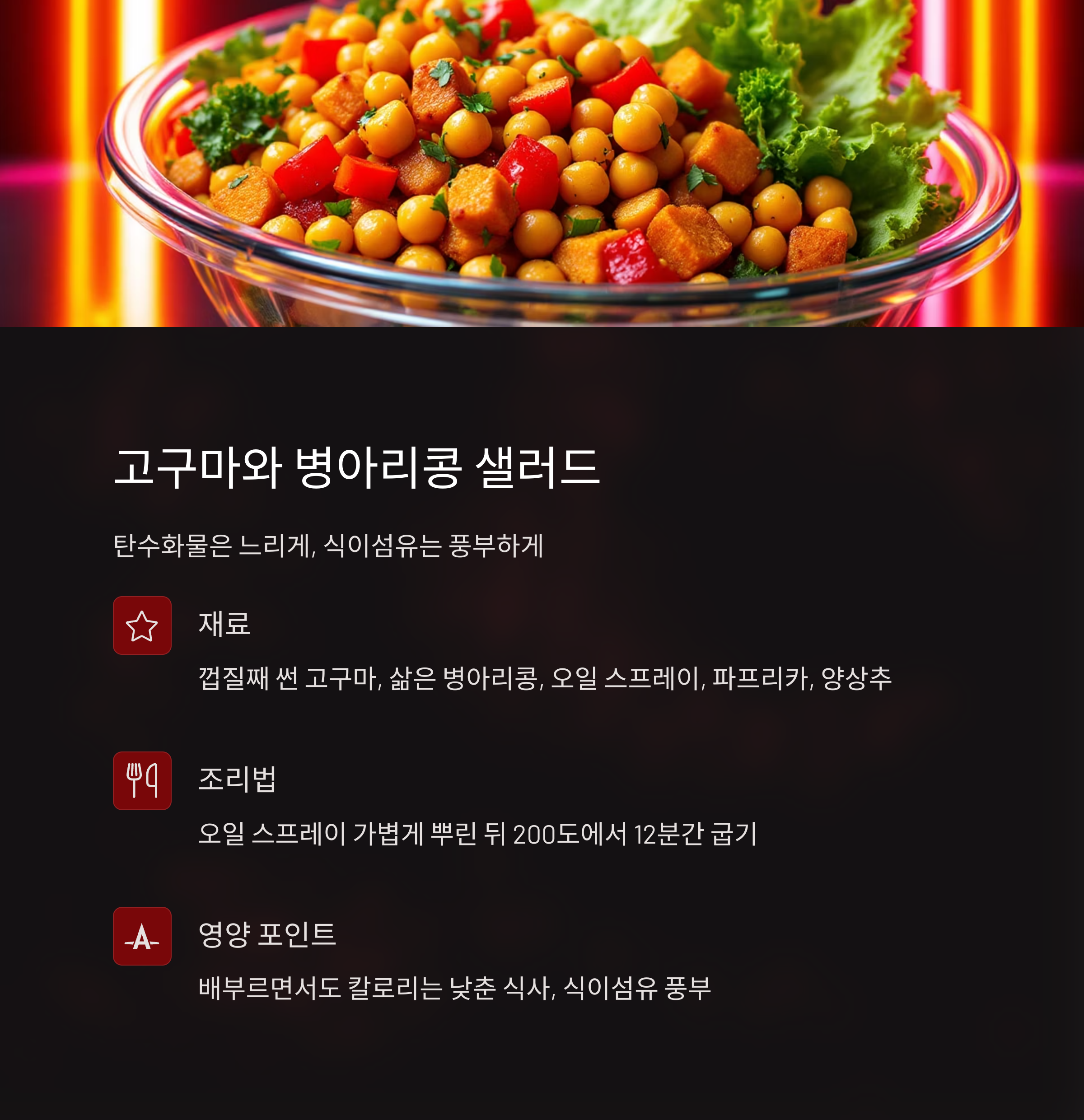 | 고구마+콩샐러드 | 약 350kcal | 약 15분 |