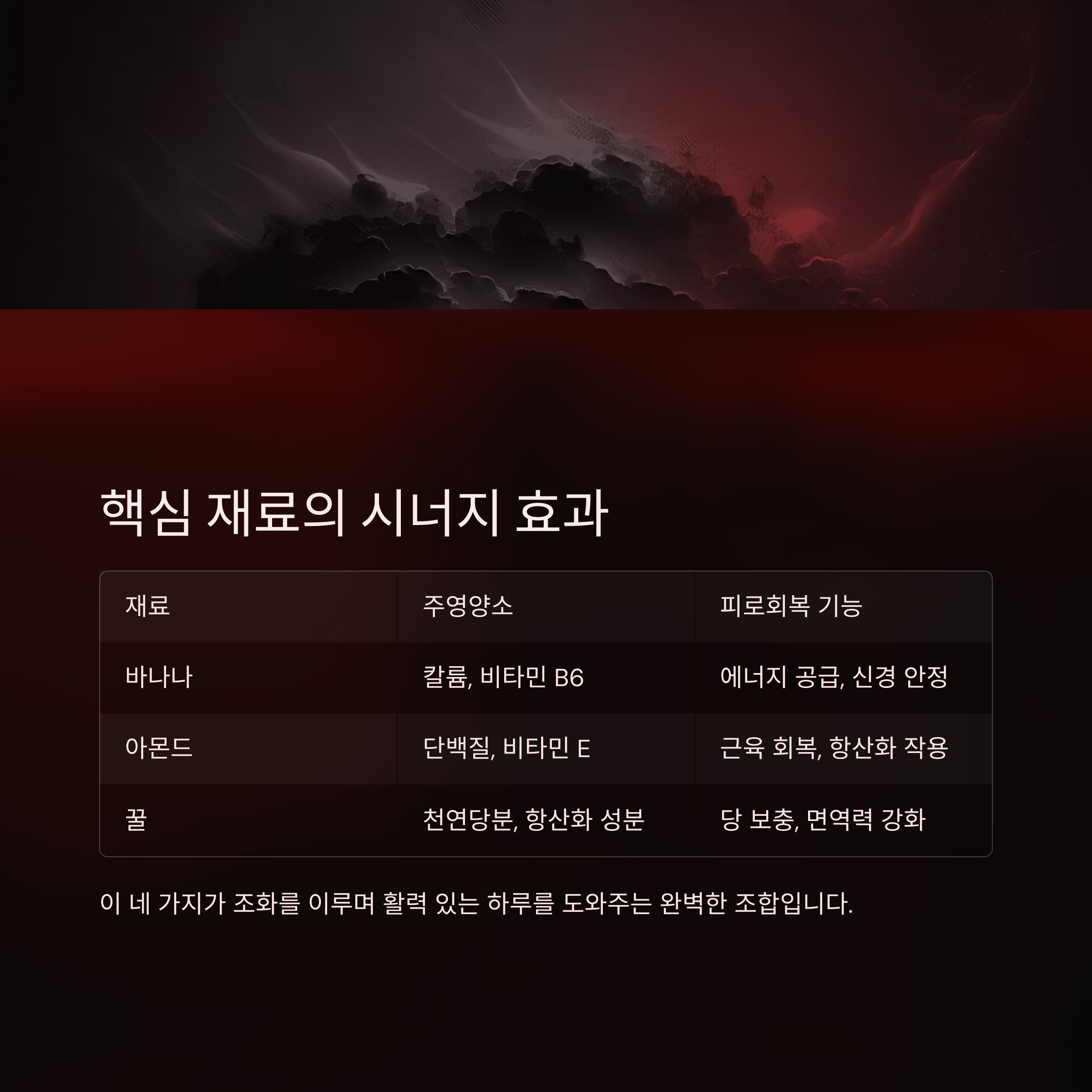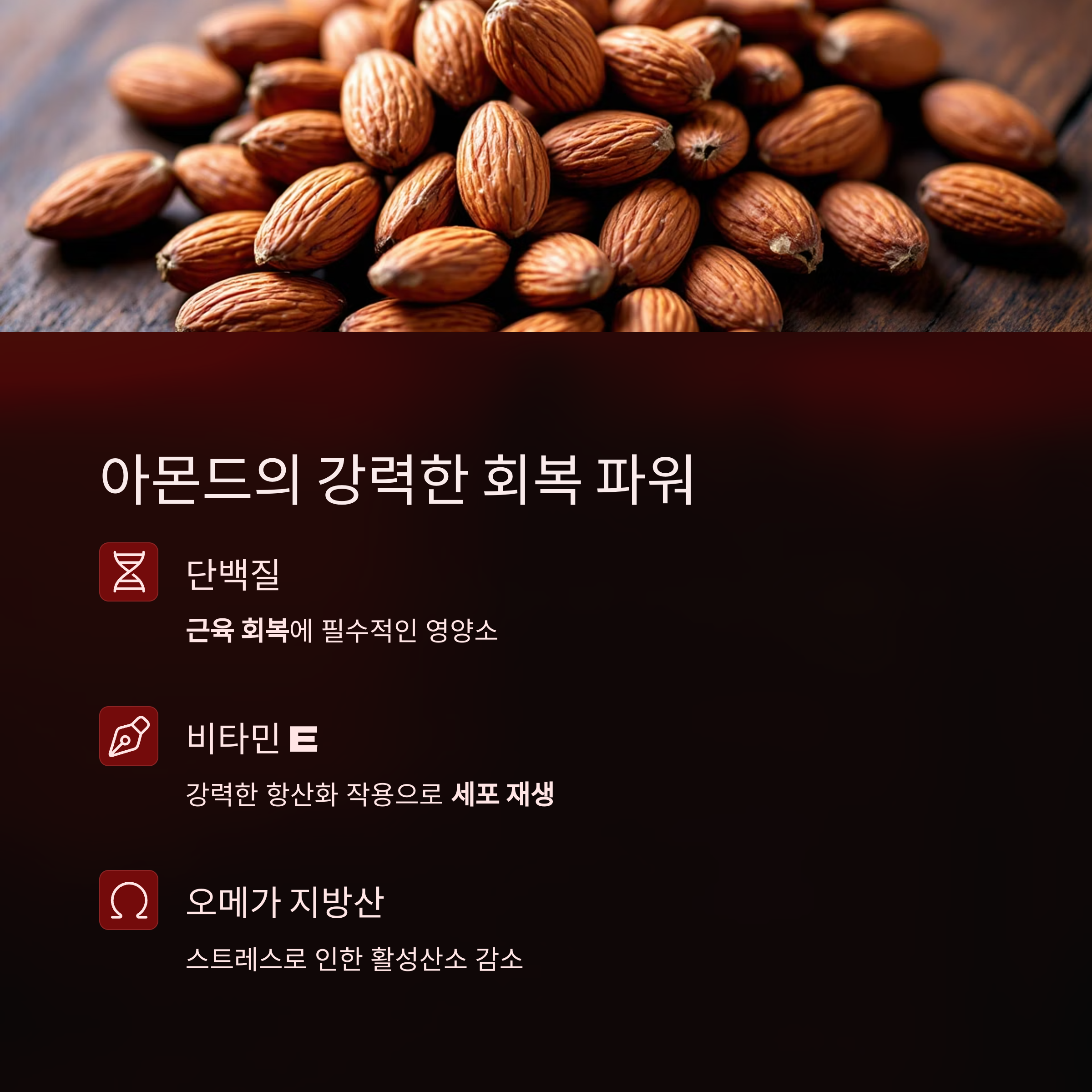 | 아몬드 | 단백질, 비타민 E | 근육 회복, 항산화 작용 |