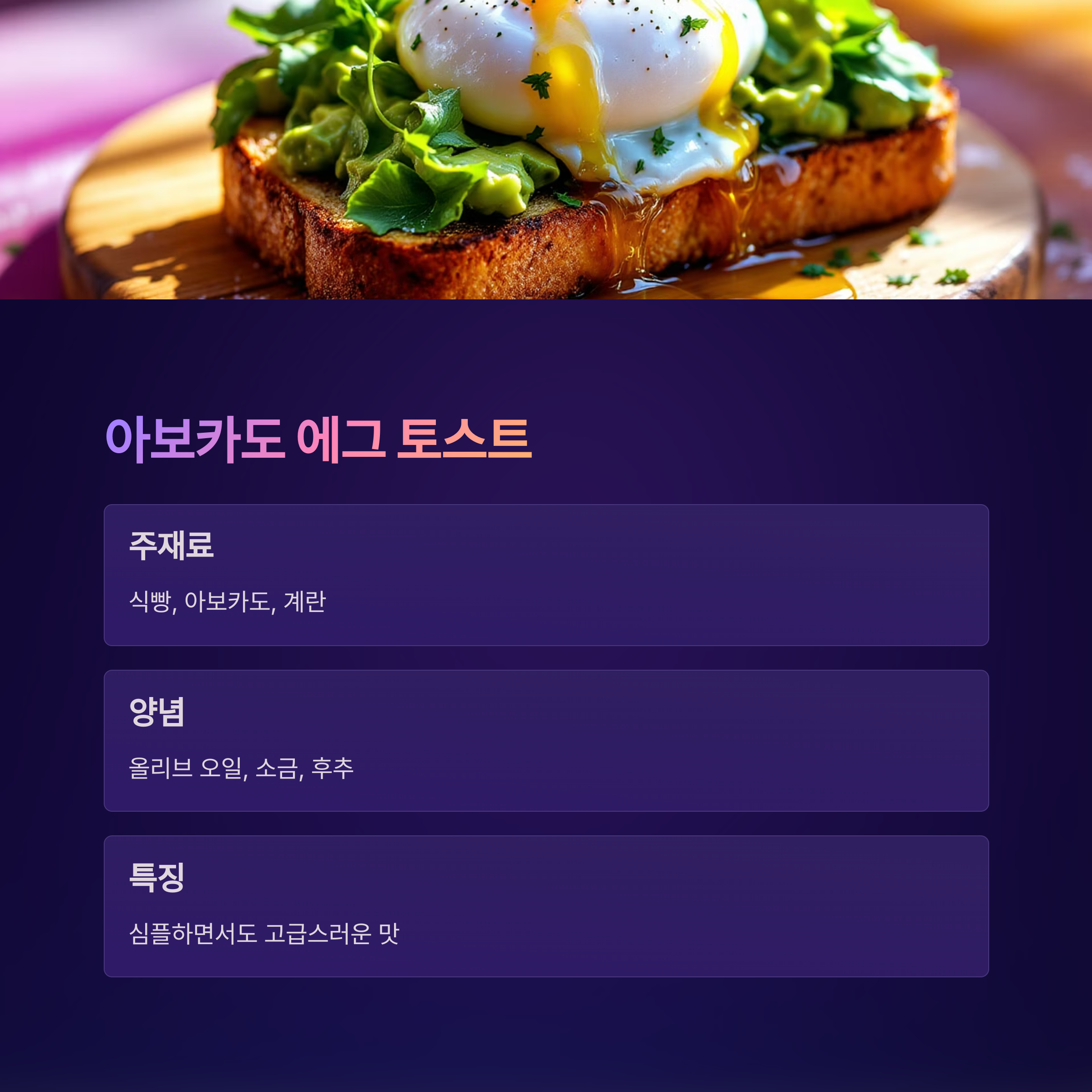 | 아보카도 에그 토스트 | 담백하고 건강함 | 다이어트·건강 관심자 |