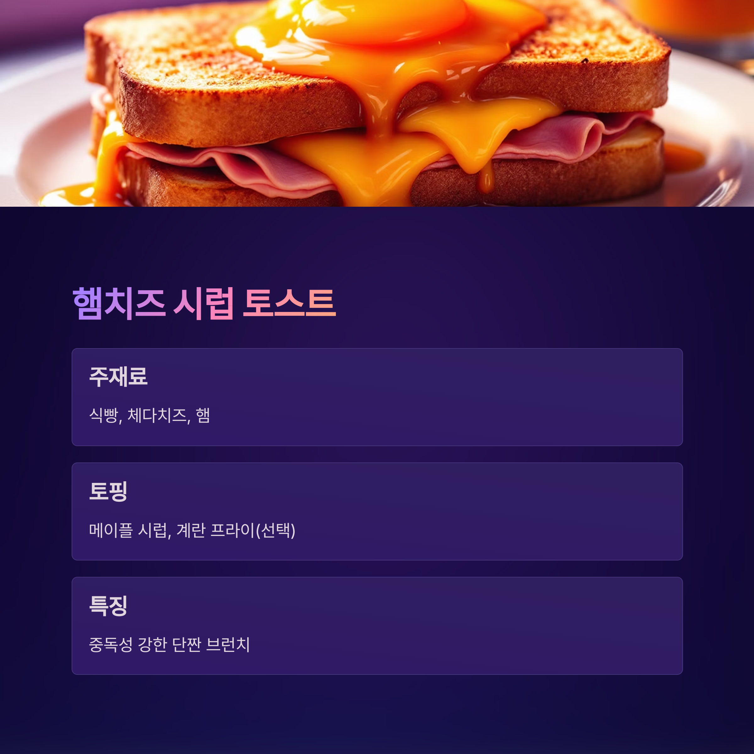| 햄치즈 시럽 토스트 | 단짠 조화로움 | 든든한 한 끼 원하는 분 |