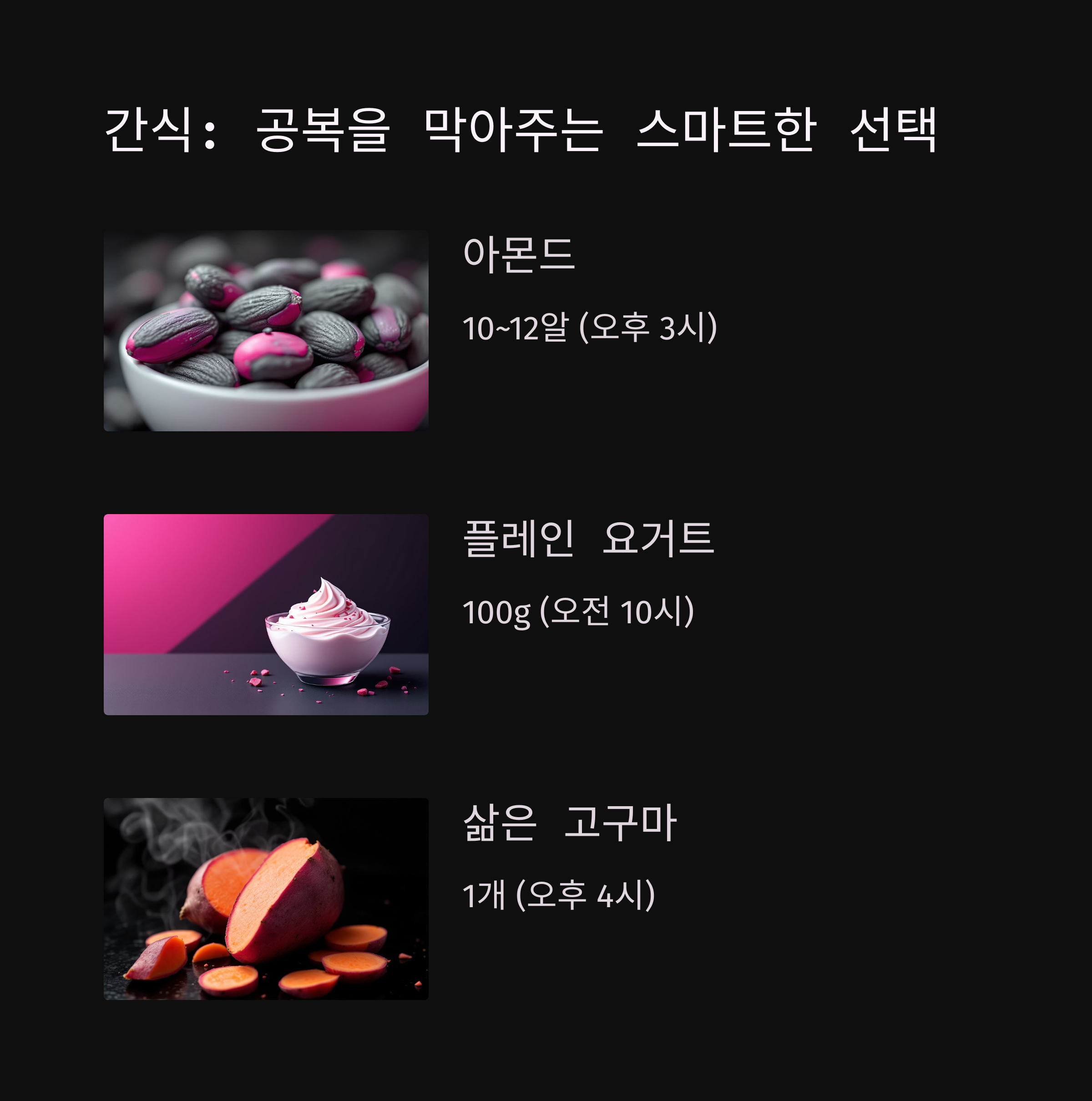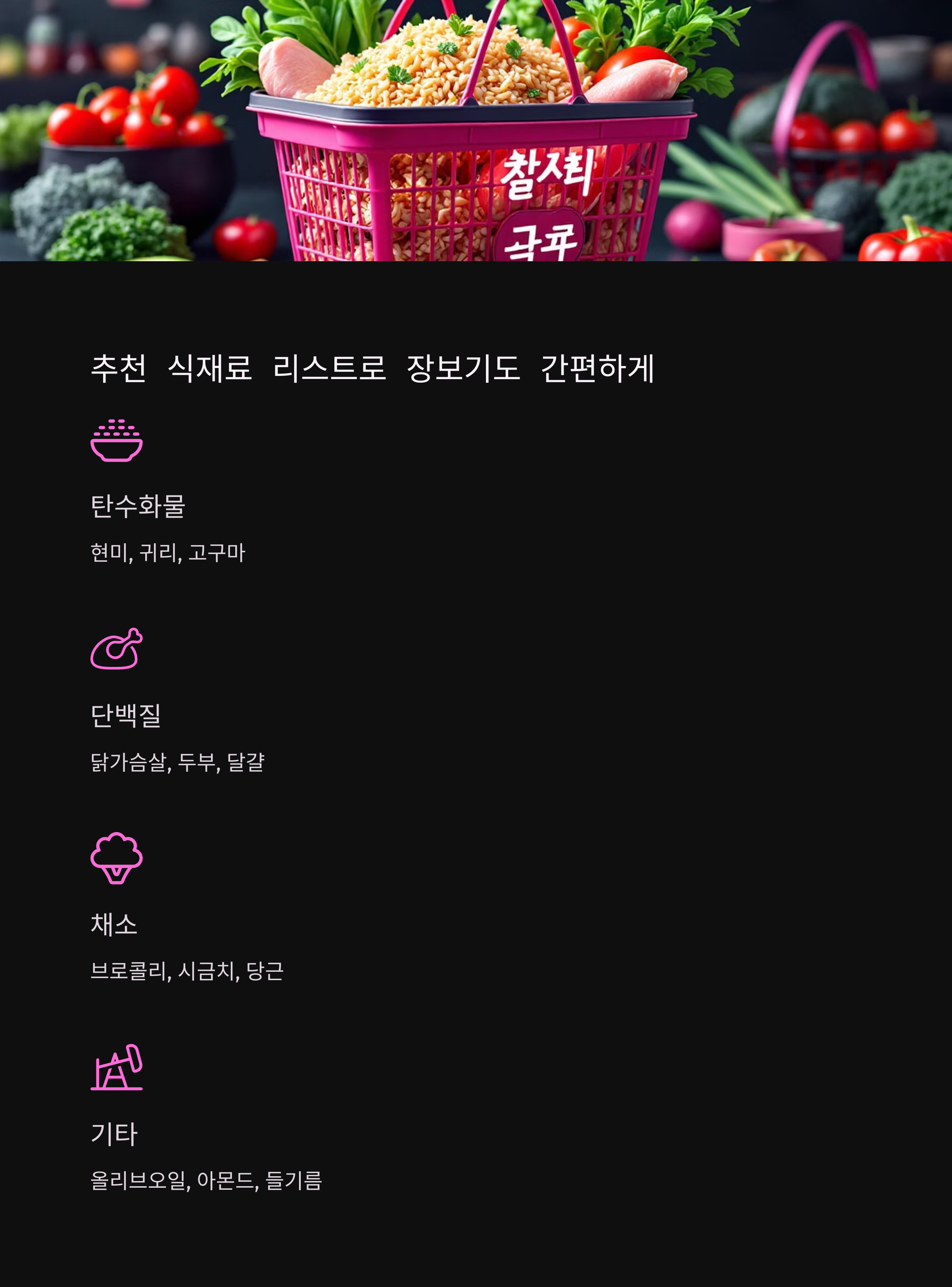 | 단백질 | 닭가슴살, 두부, 달걀 |