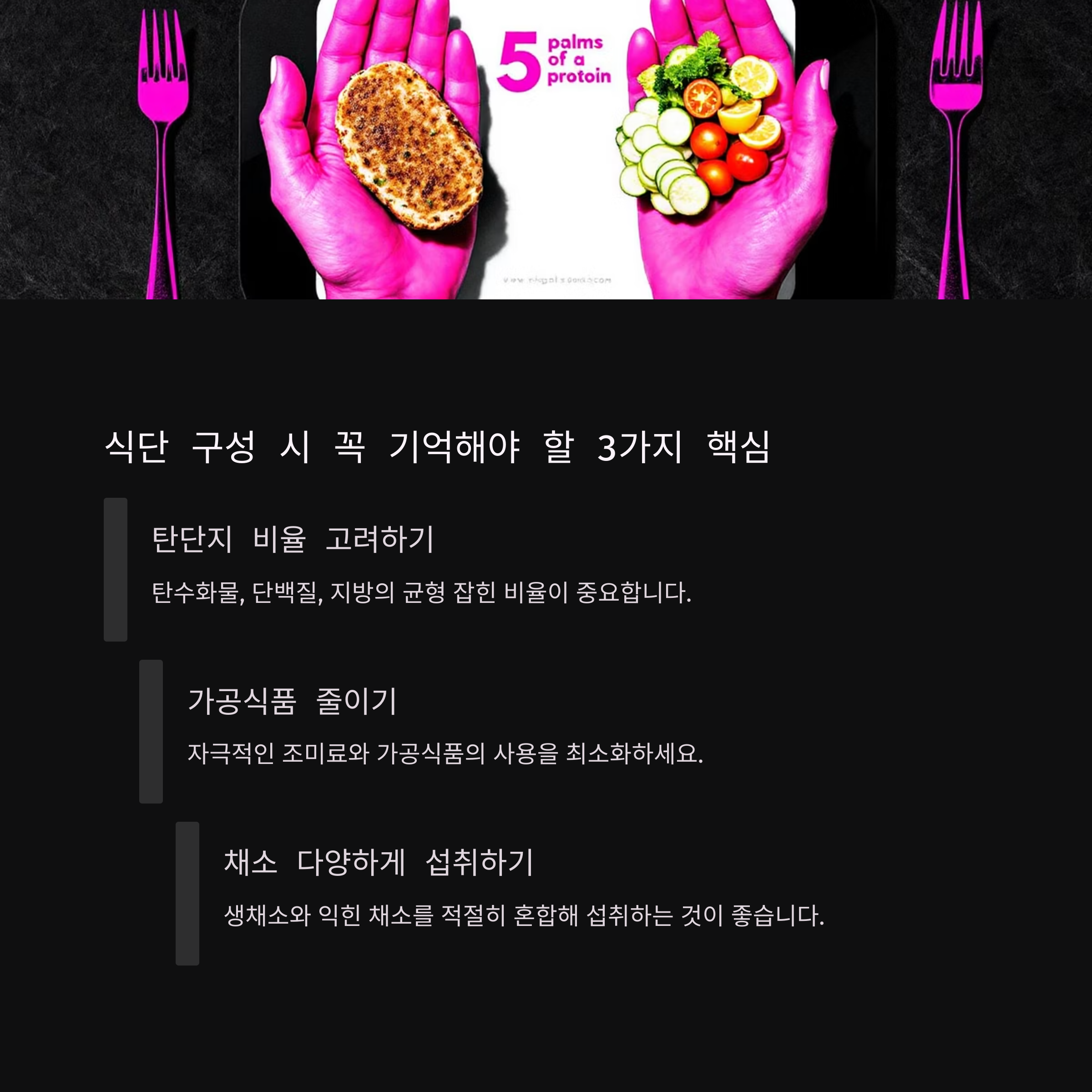 - 탄단지(탄수화물, 단백질, 지방)의 비율을 고려해야 합니다.