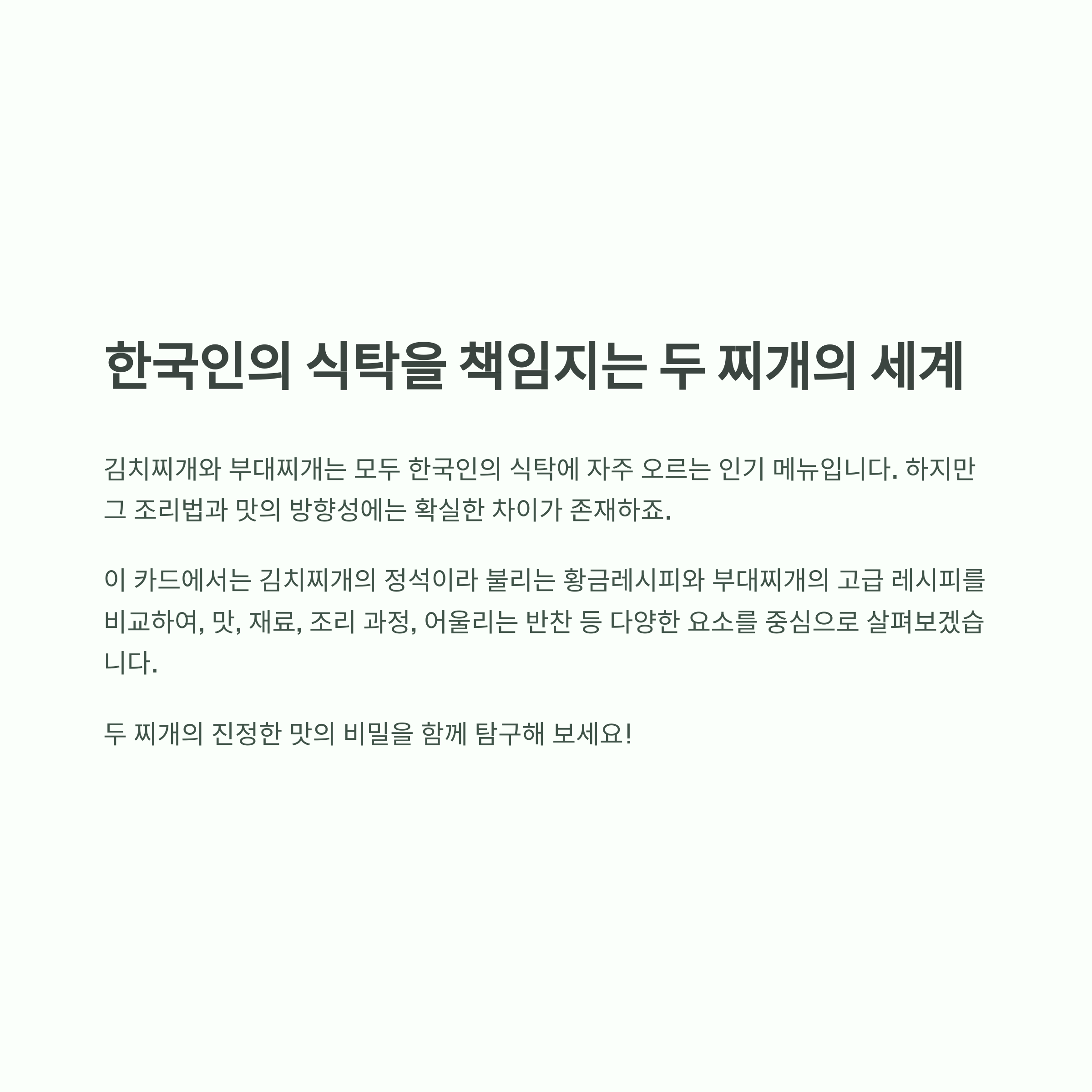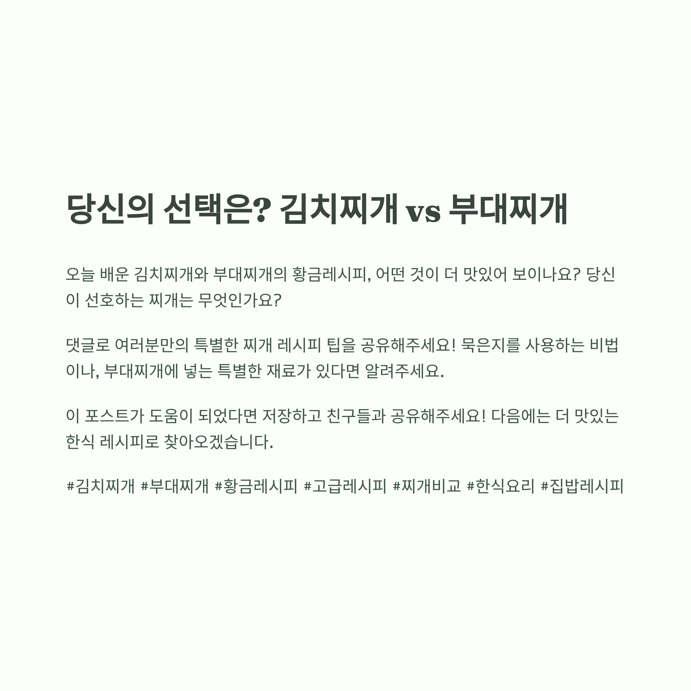 | 김치찌개 vs 부대찌개, 당신의 입맛을 사로잡는 찌개는? (0) | 2025.07.08 |