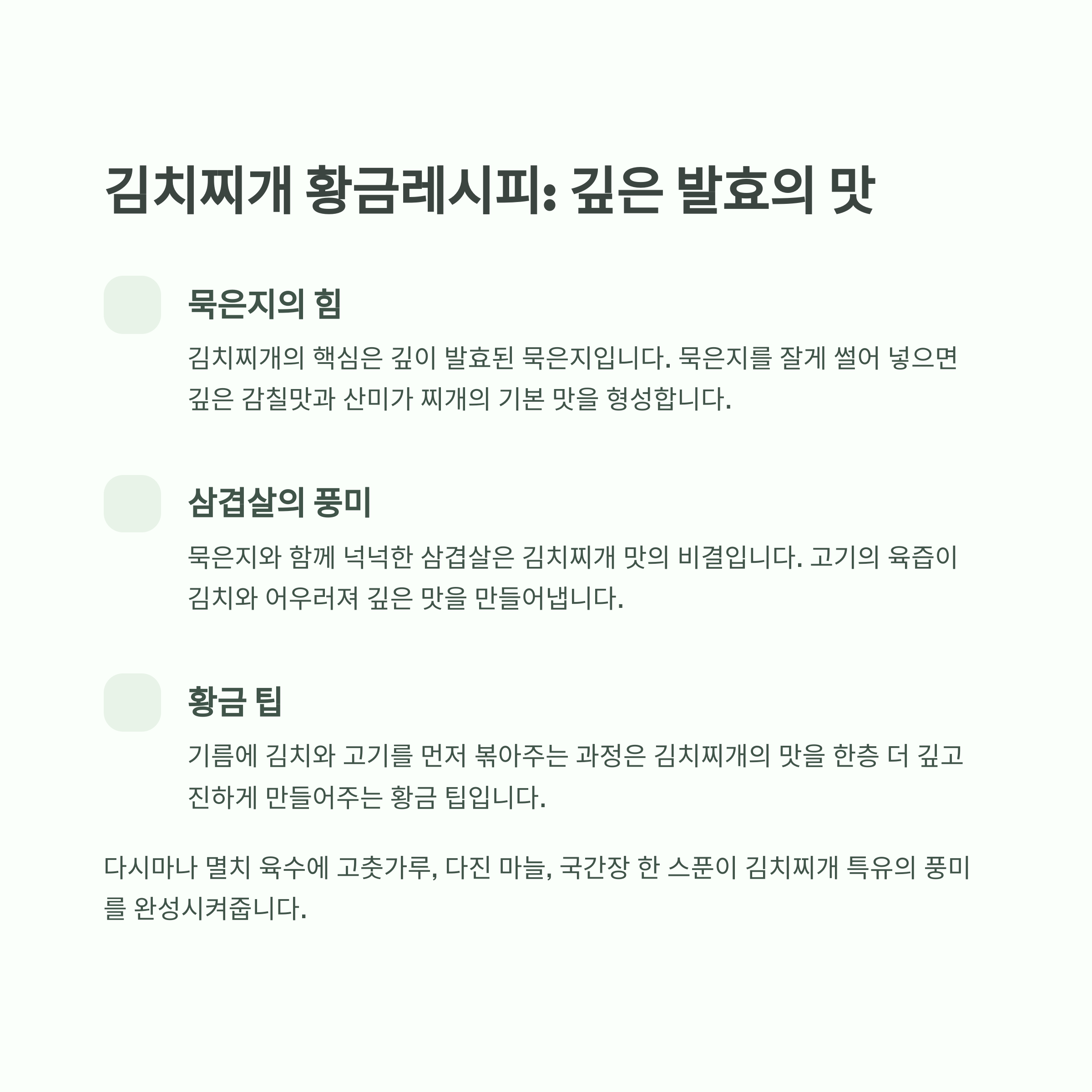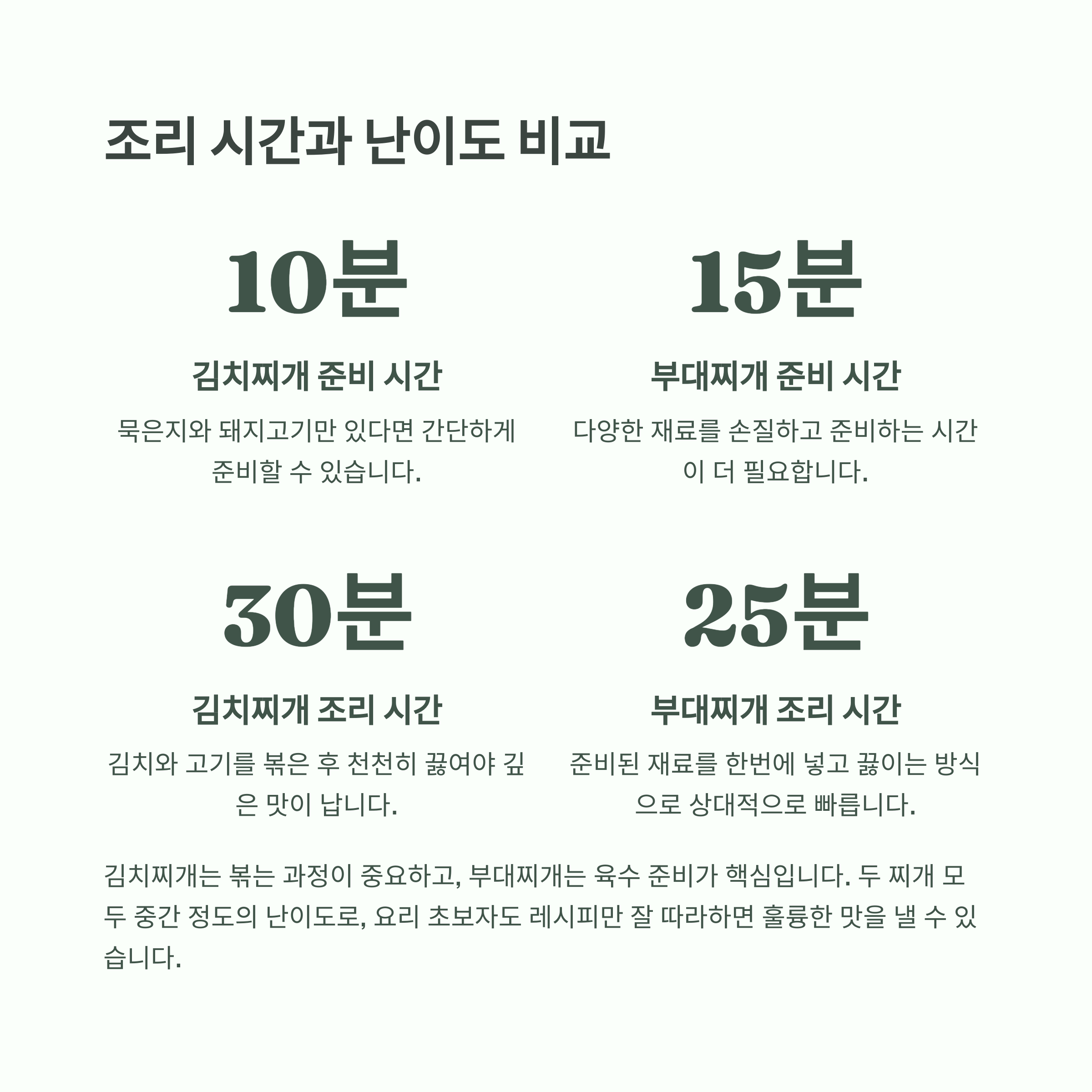 | 요리 팁 | 볶은 김치로 시작 | 육수 미리 끓이기 |