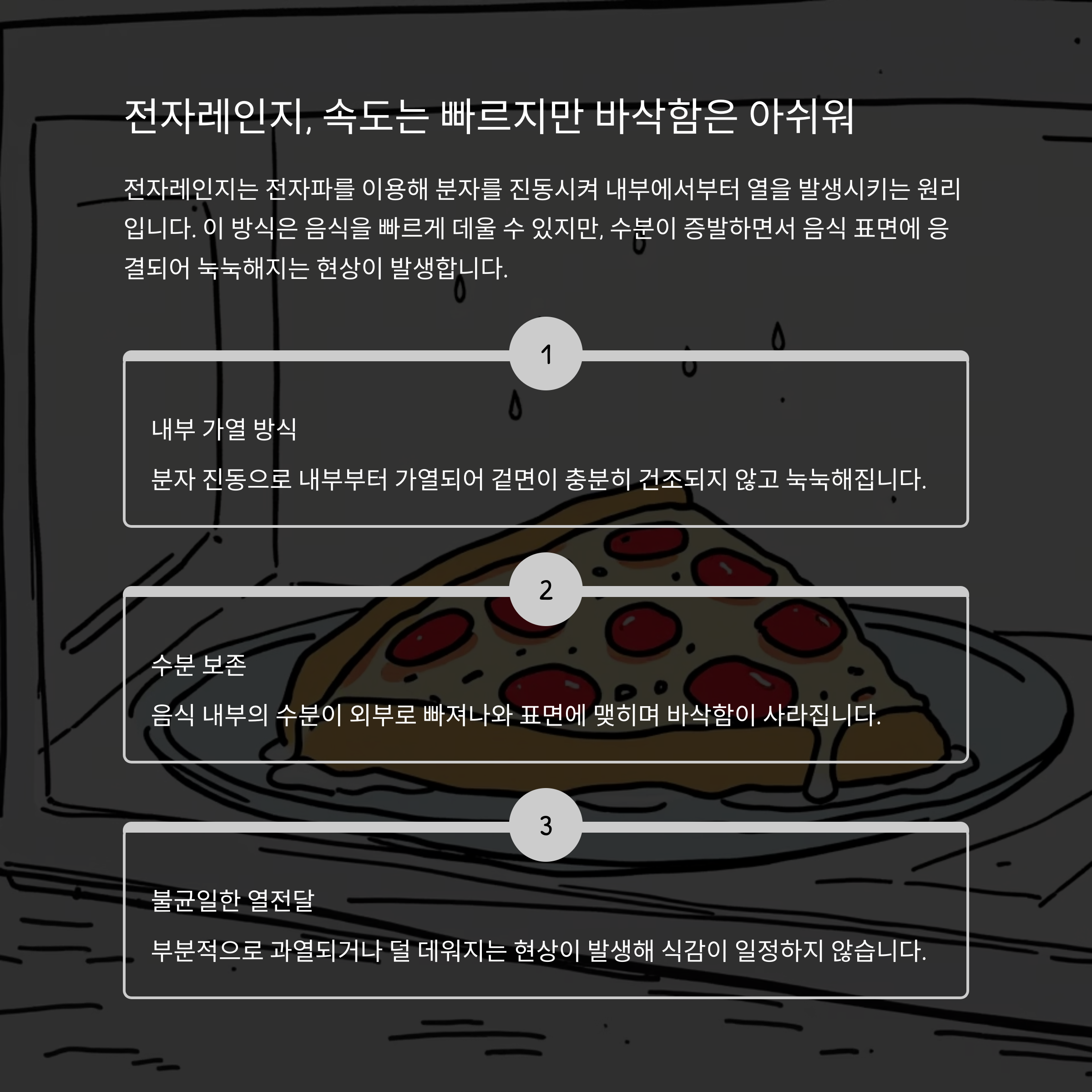 이로 인해 음식이 빠르게 데워지지만 겉면이 마르거나 눅눅해지기 쉽습니다.