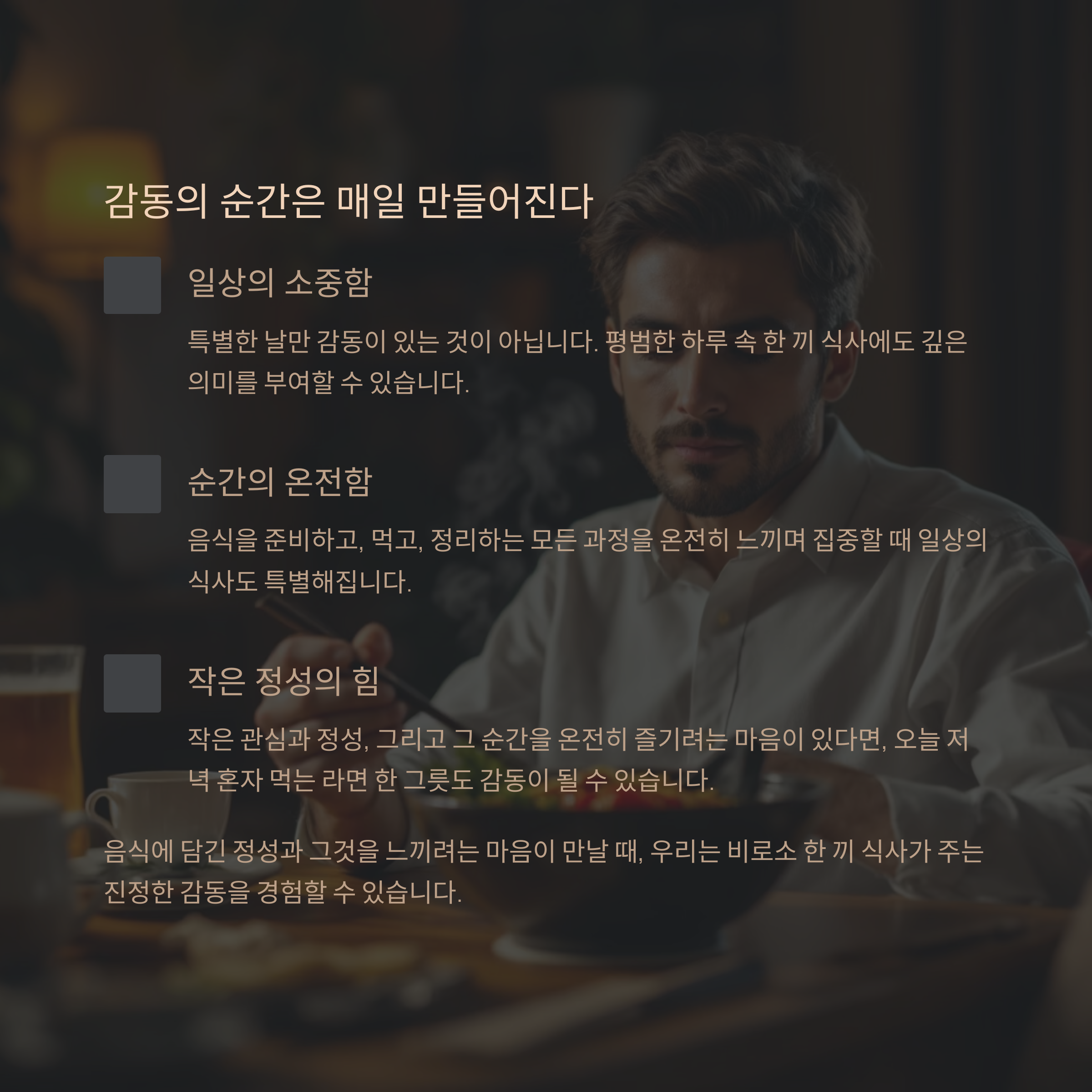 혼자 먹는 한 끼와 집밥의 차이, 감동은 어디서 더 깊을까?