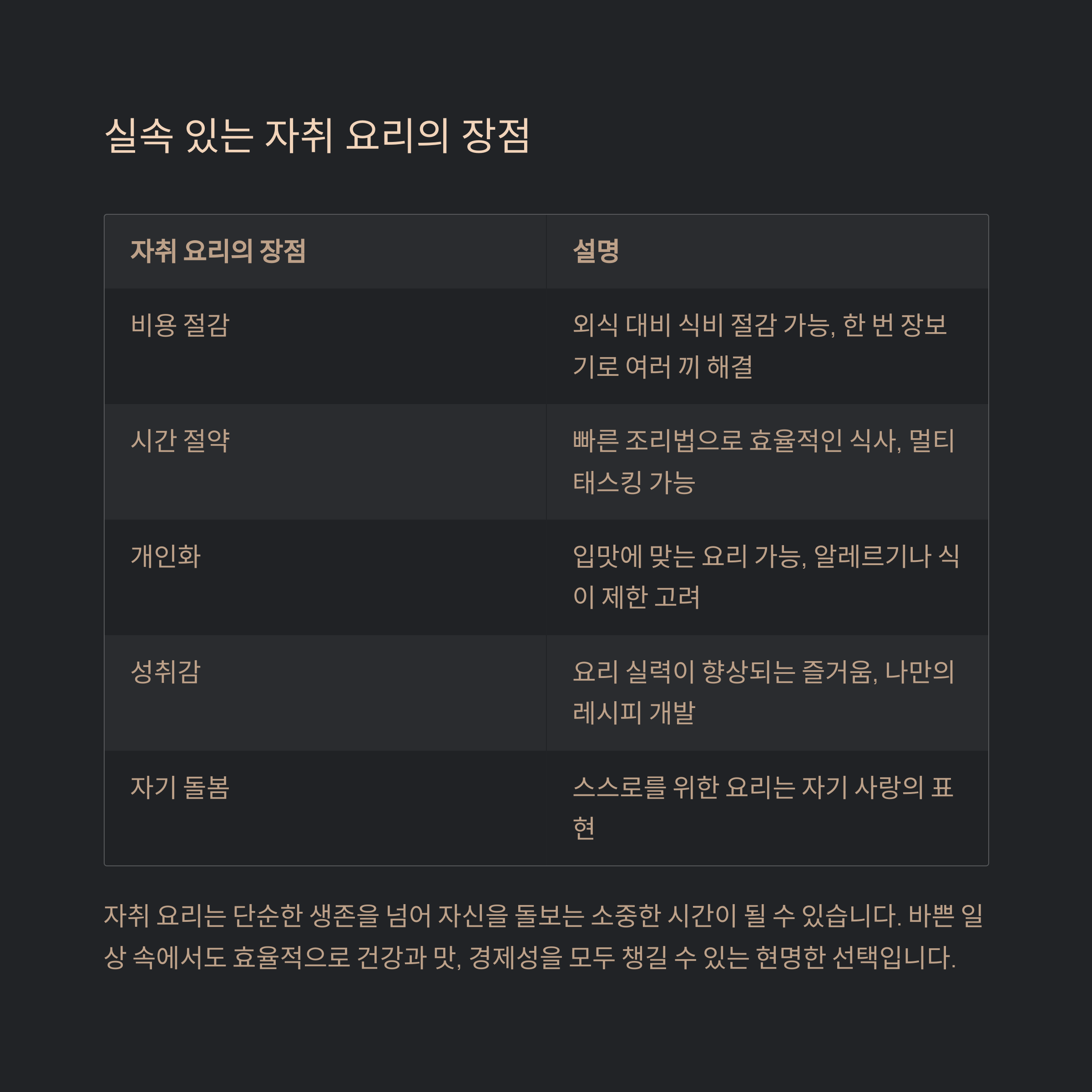 | 비용 절감 | 외식 대비 식비 절감 가능 |