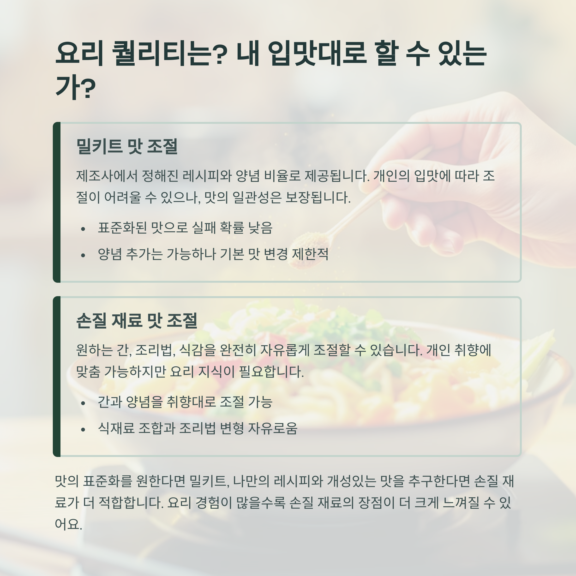 맛의 일관성과 간편함에서는 밀키트가 안정적입니다.