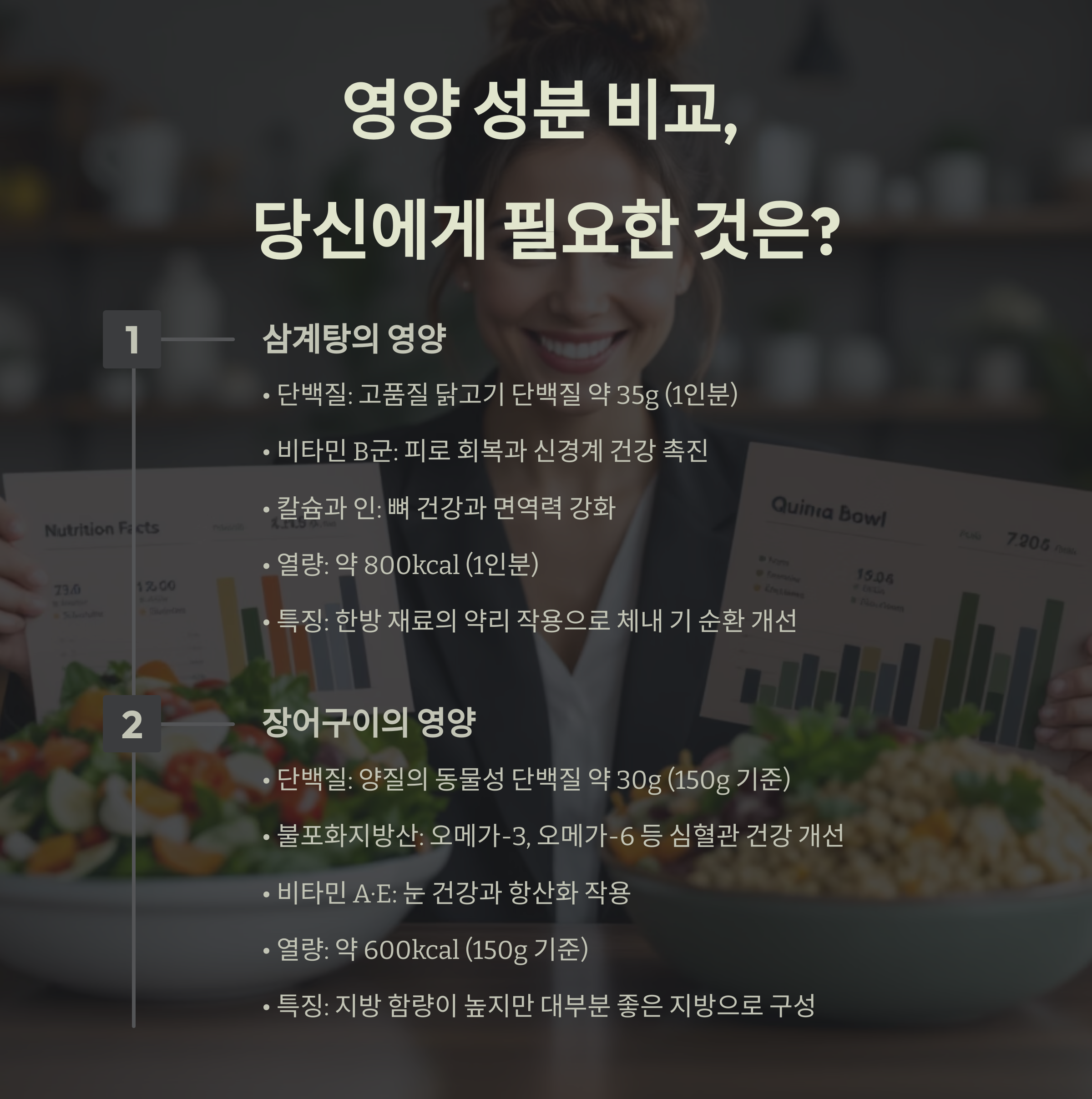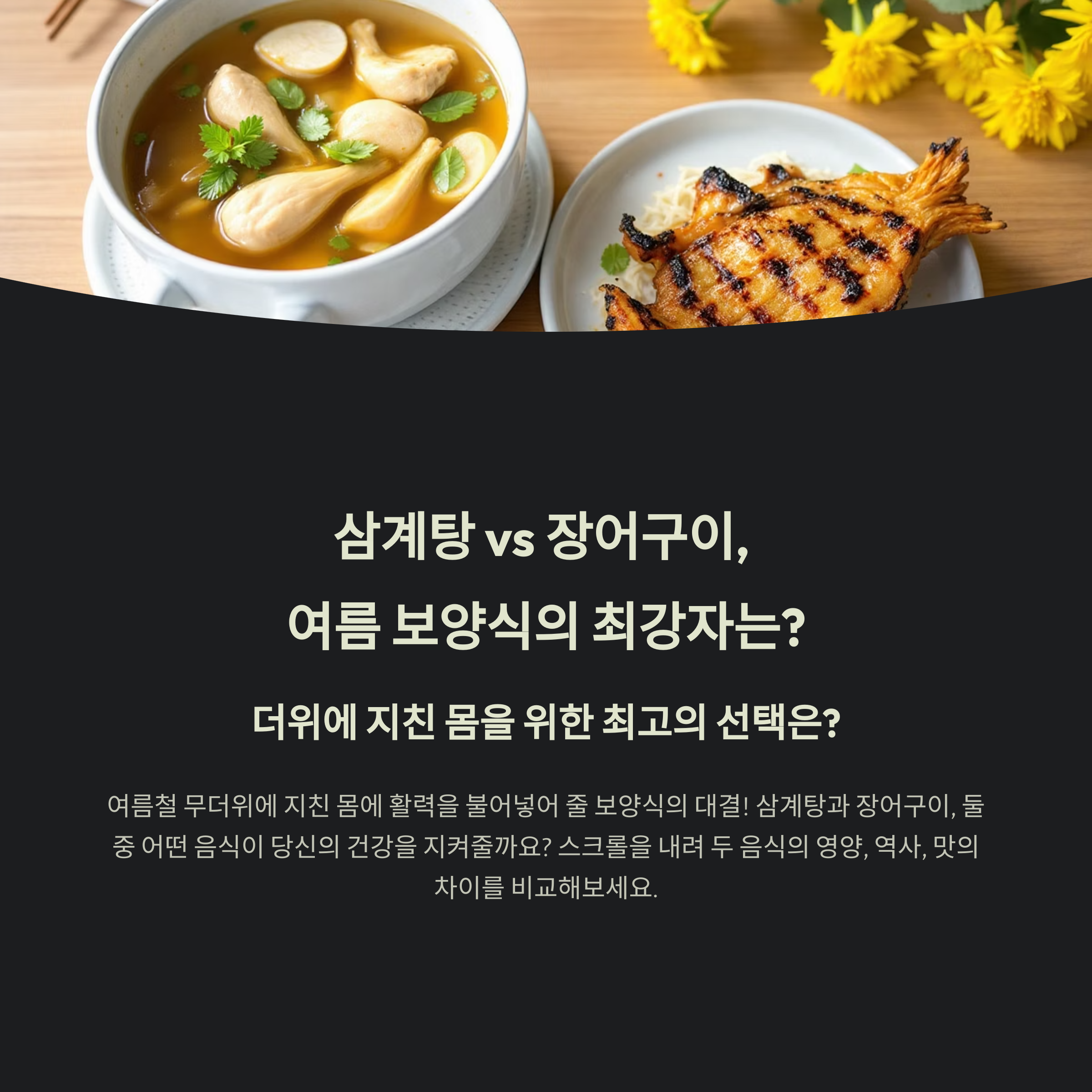 이번 글에서는 삼계탕과 장어구이의 영양 정보, 역사, 식감, 대중성 등을 비교하여