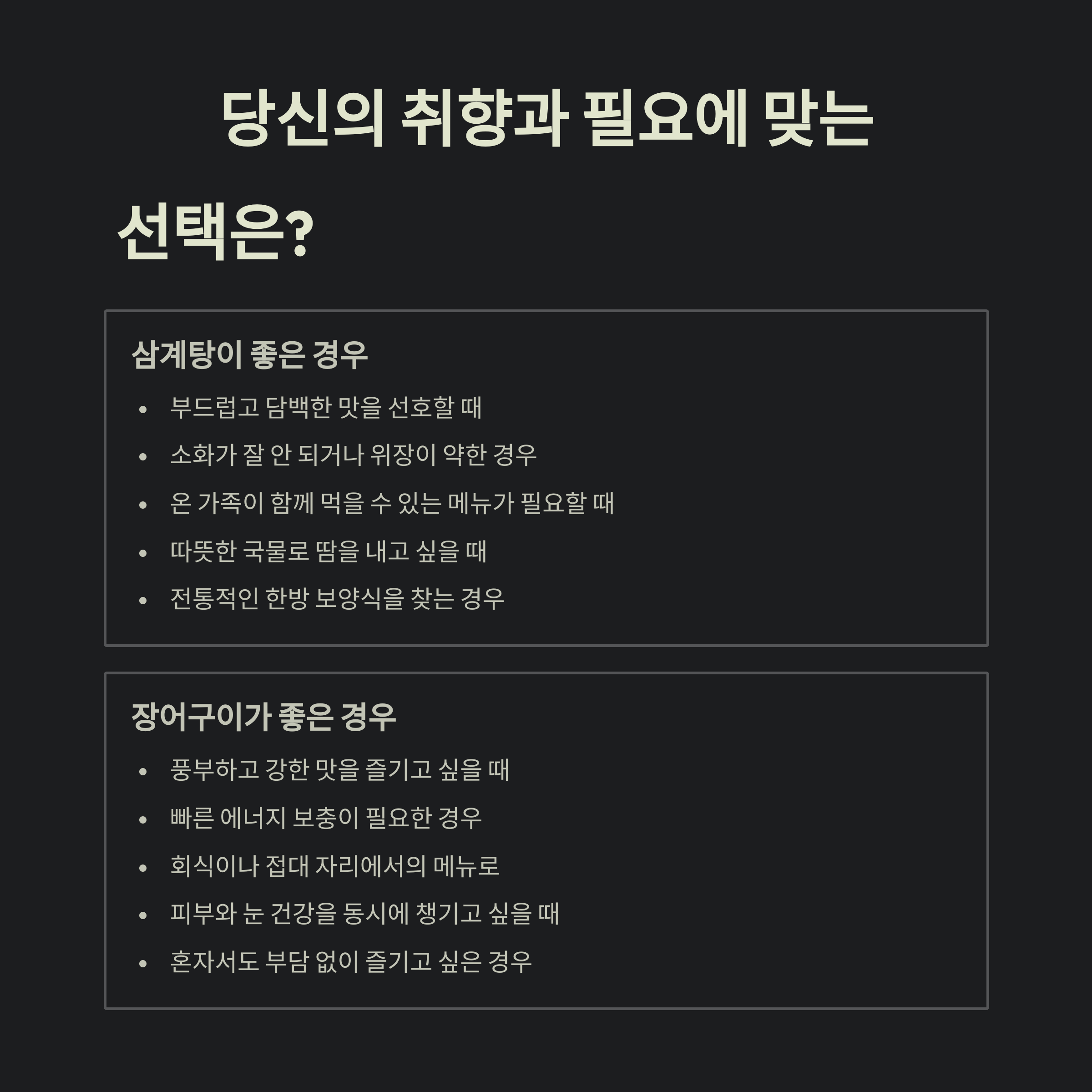 두 음식 모두 체력 회복에 탁월하지만 그 매력은 확연히 다릅니다.