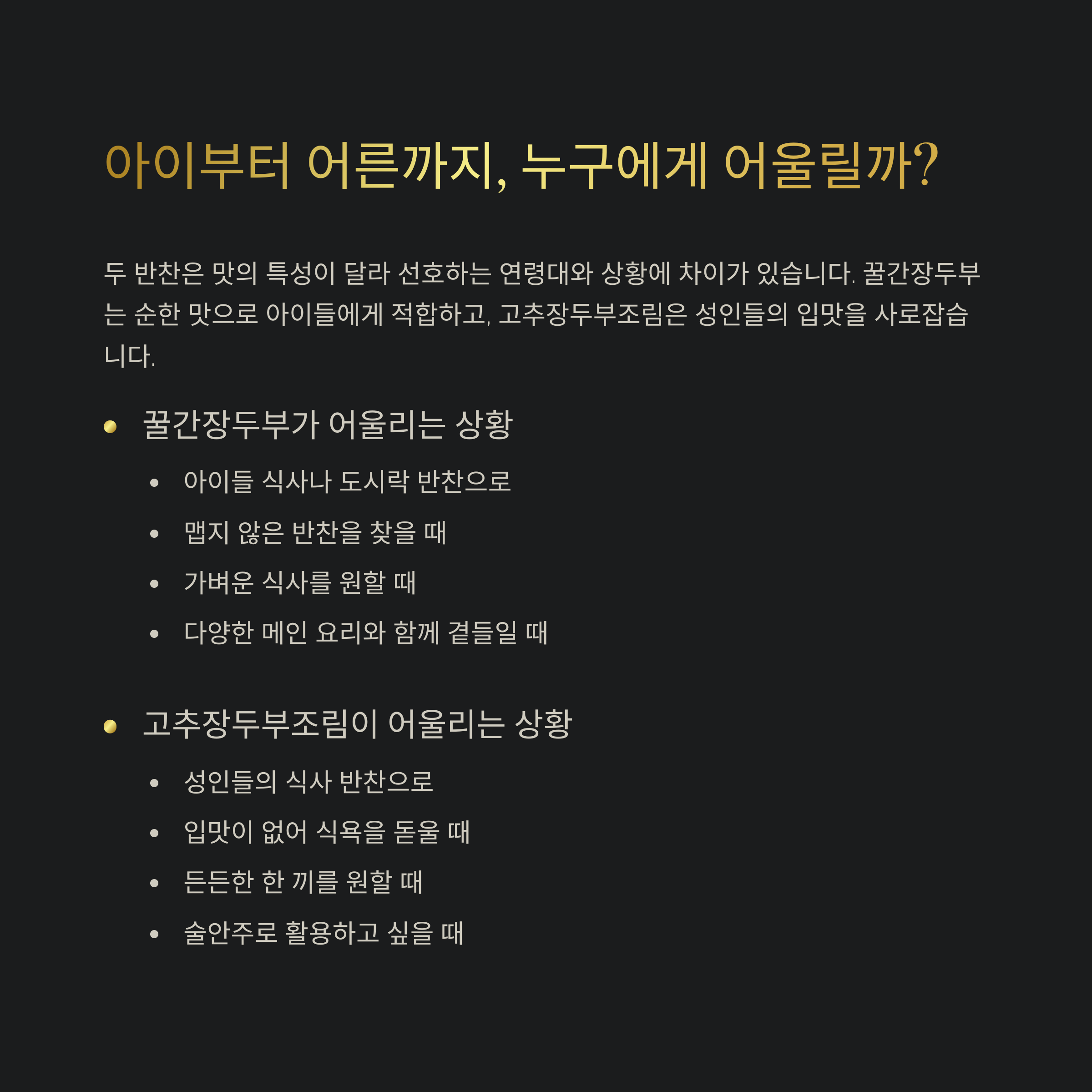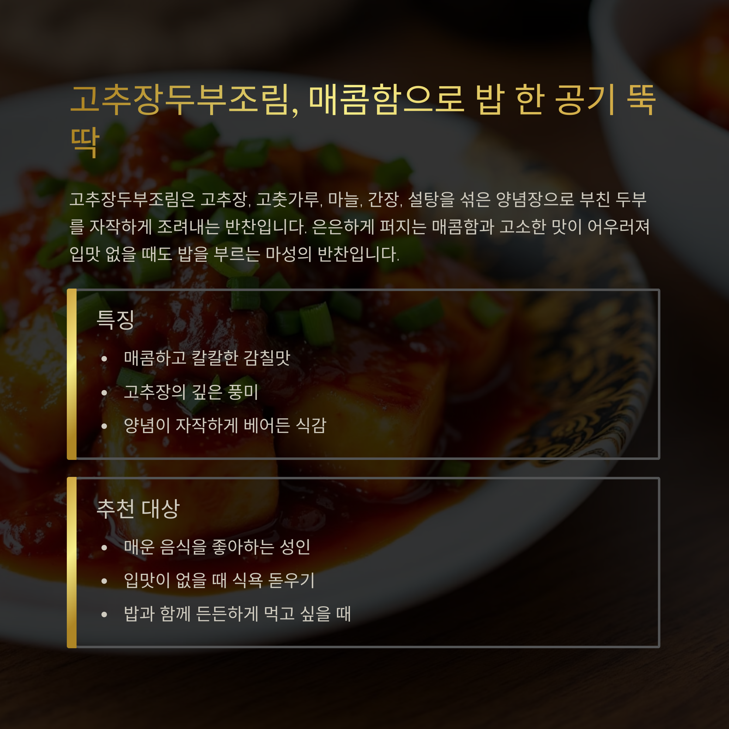 고추장두부조림은 맵고 진한 양념 덕에 성인 반찬으로 더 적합합니다.