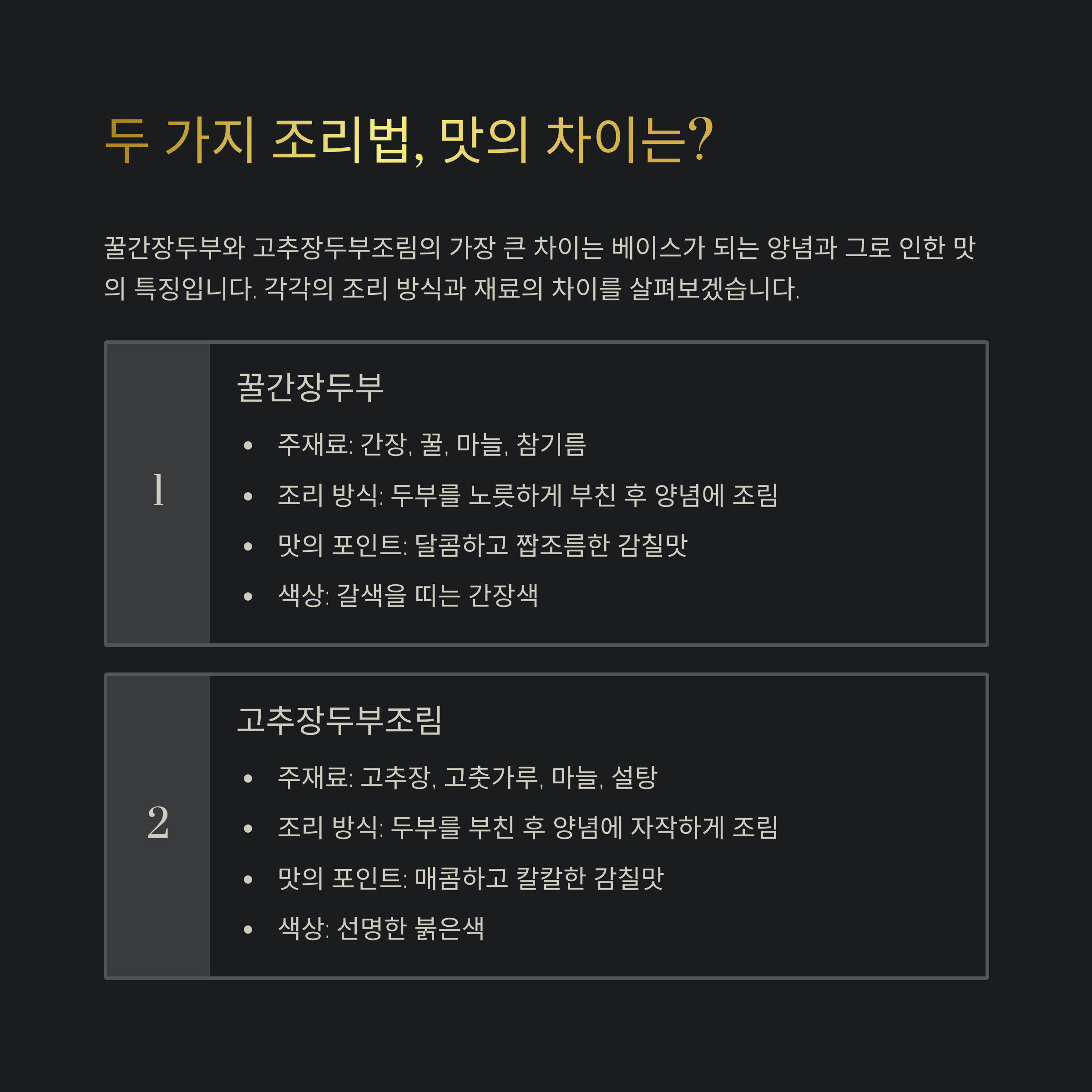 | 조리 방식 | 부침 후 조림 | 부침 후 자작하게 양념 조림 |