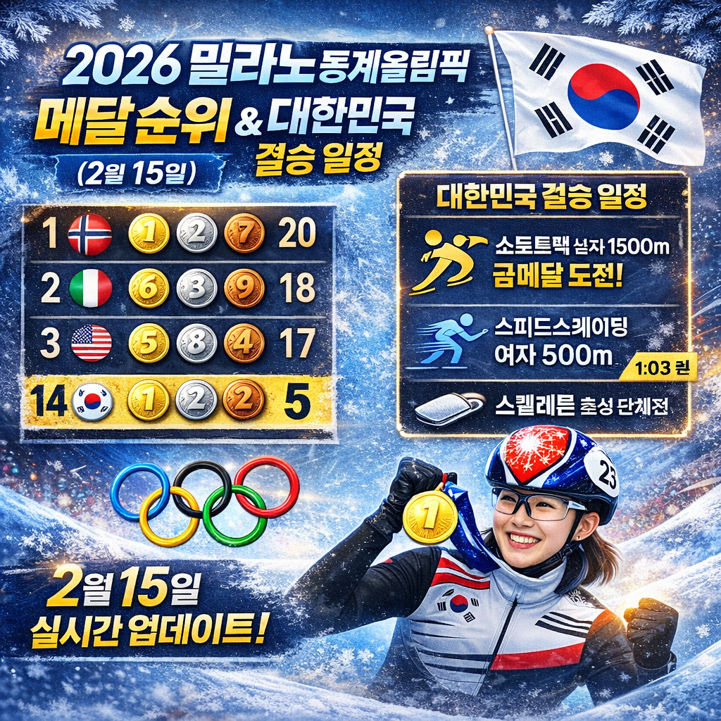 2026 밀라노 올림픽 메달 순위 & 대한민국 결승 일정 (2월 15일)