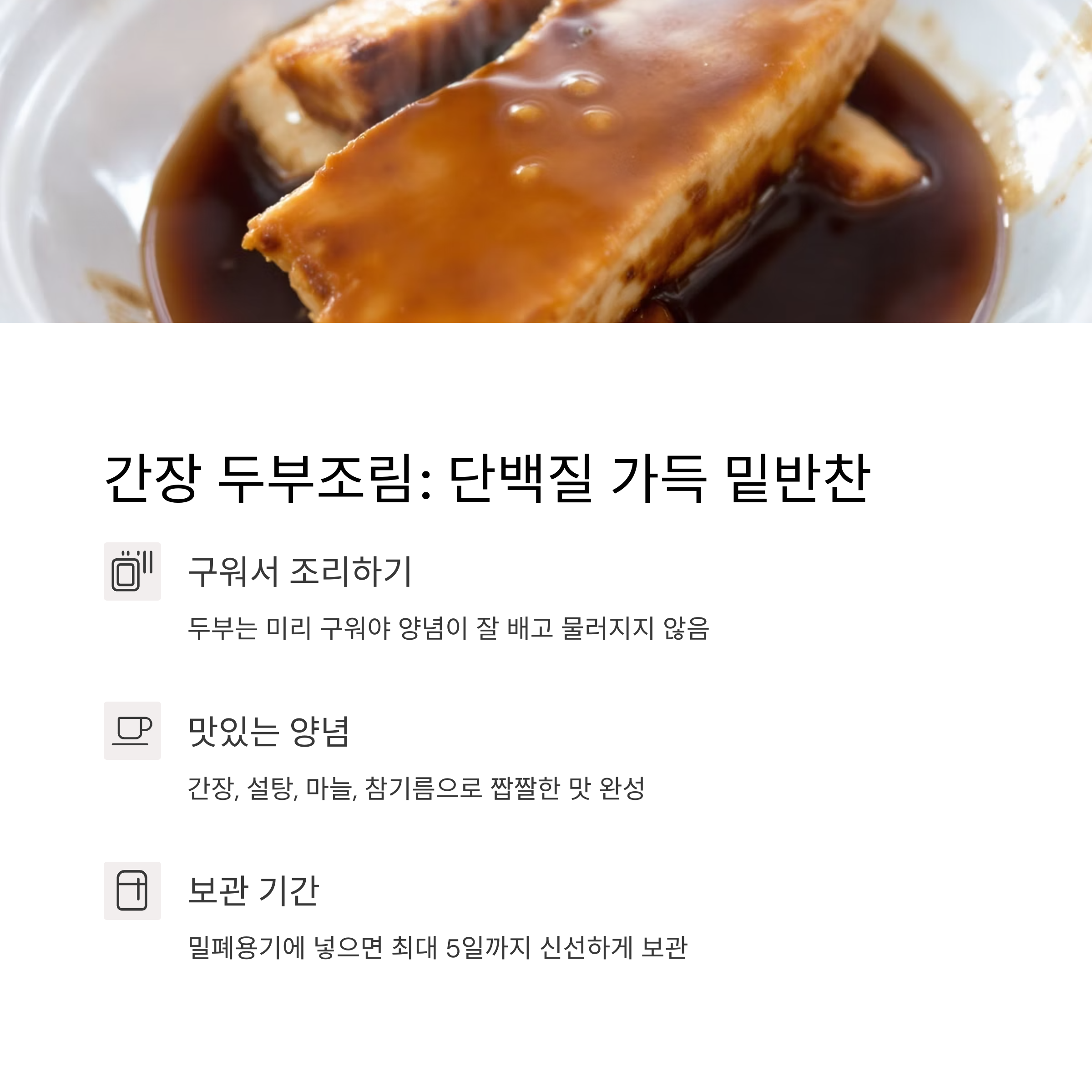 | 간장 두부조림 | 약 15분 | 4~5일 | 양념은 식힌 후 부어 보관 |