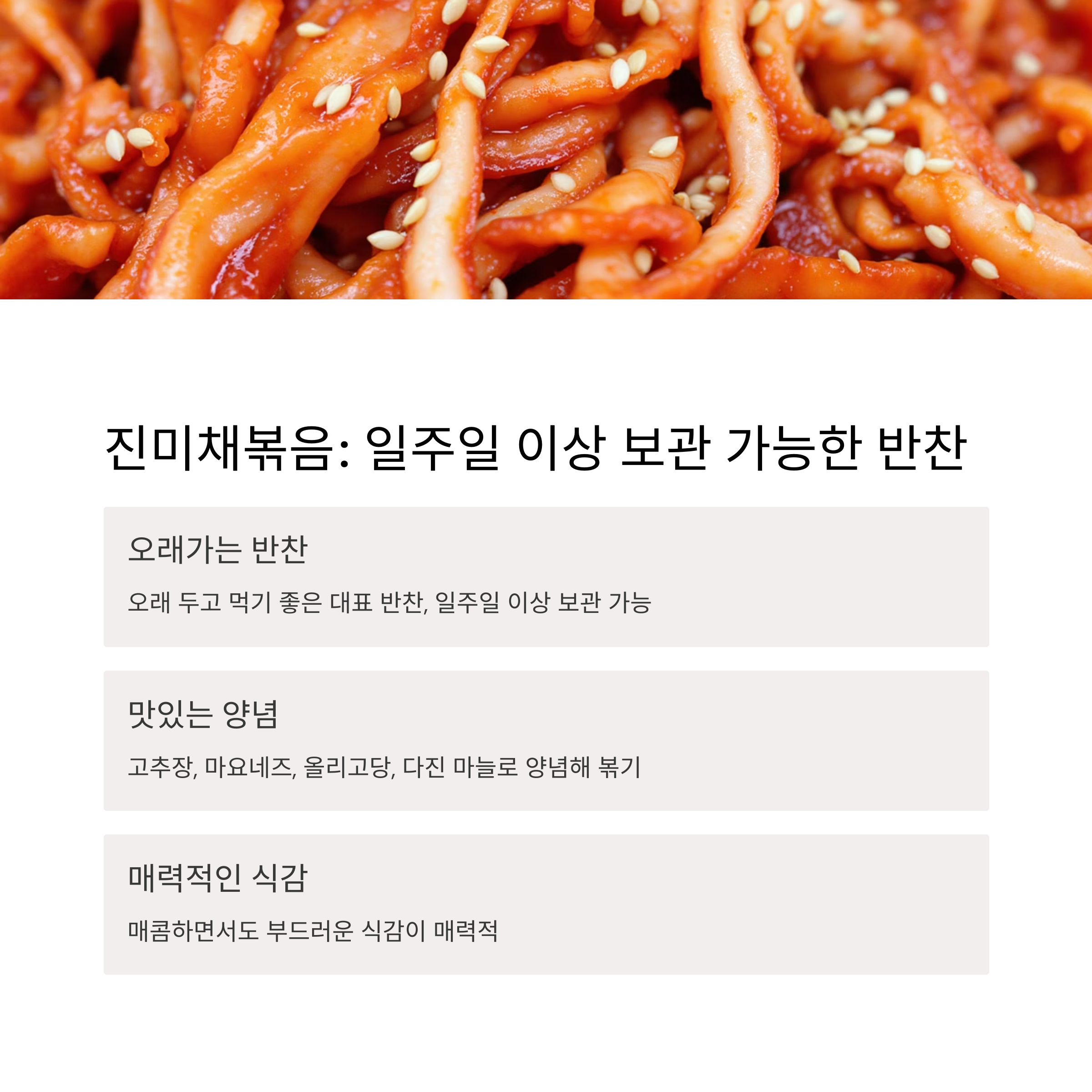 | 진미채볶음 | 약 15분 | 7일 이상 | 너무 오래 볶지 않기 |
