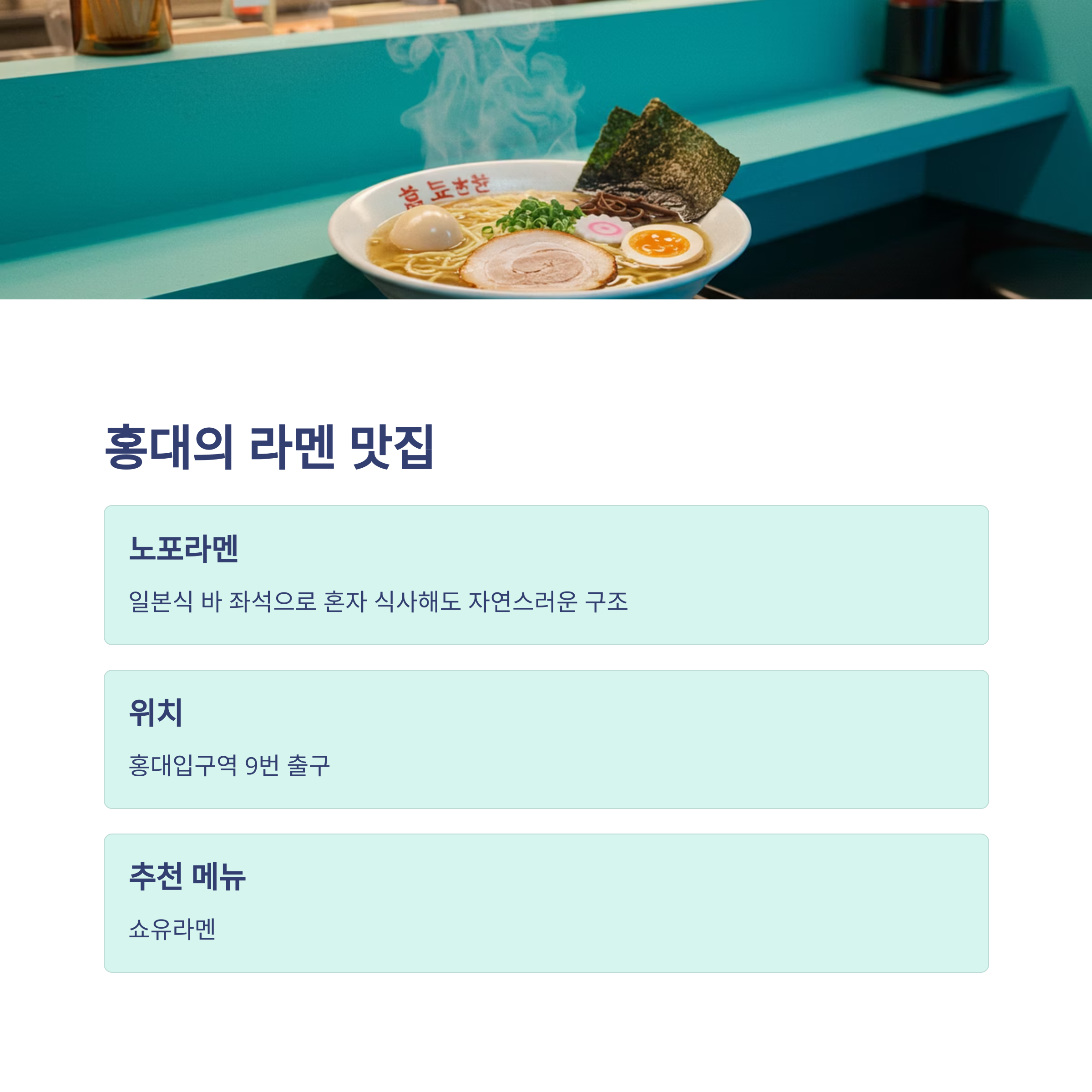 | 홍대 | 노포라멘 | 쇼유라멘 |