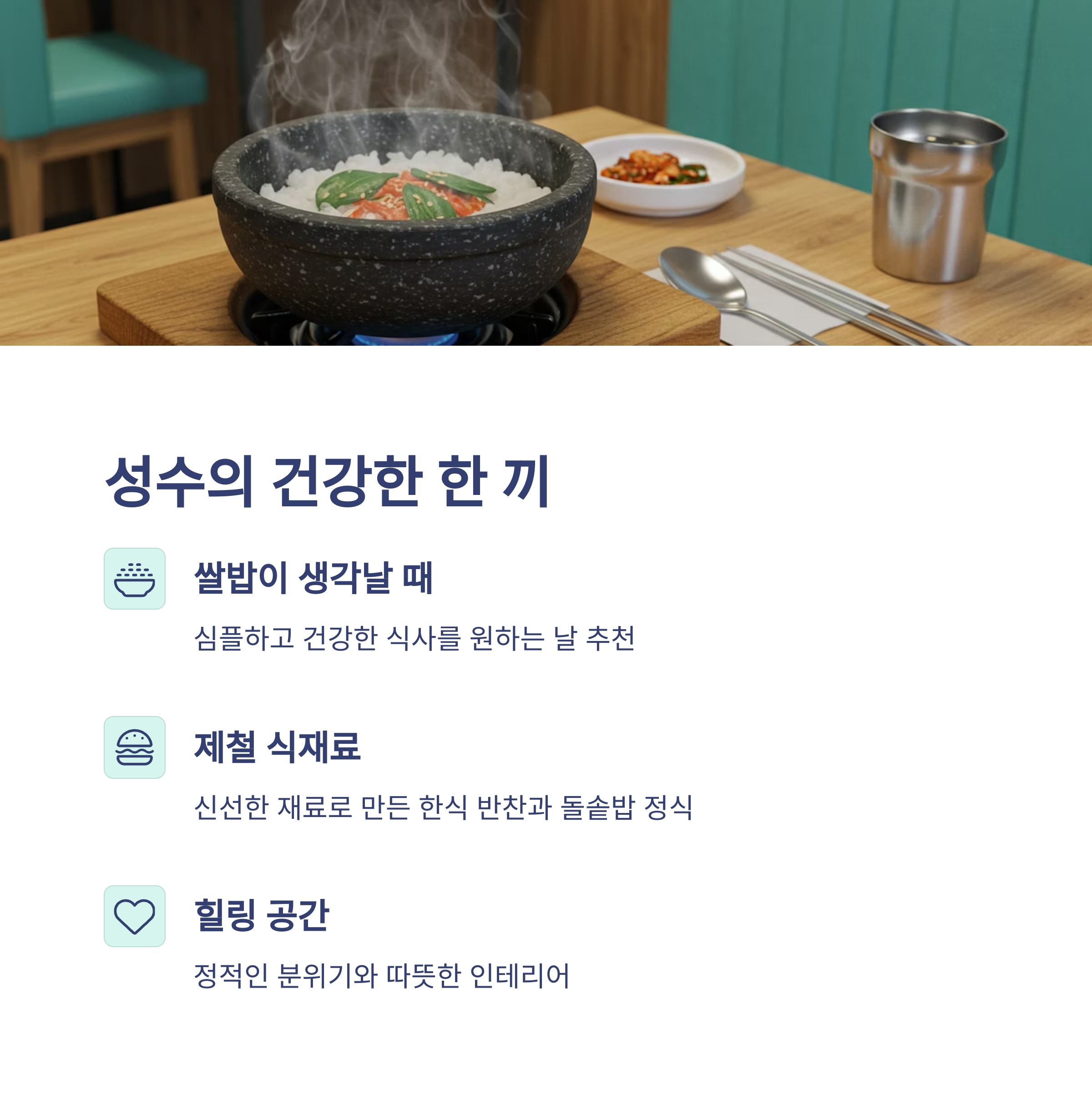 | 성수 | 쌀밥이 생각날 때 | 돌솥밥 정식 |