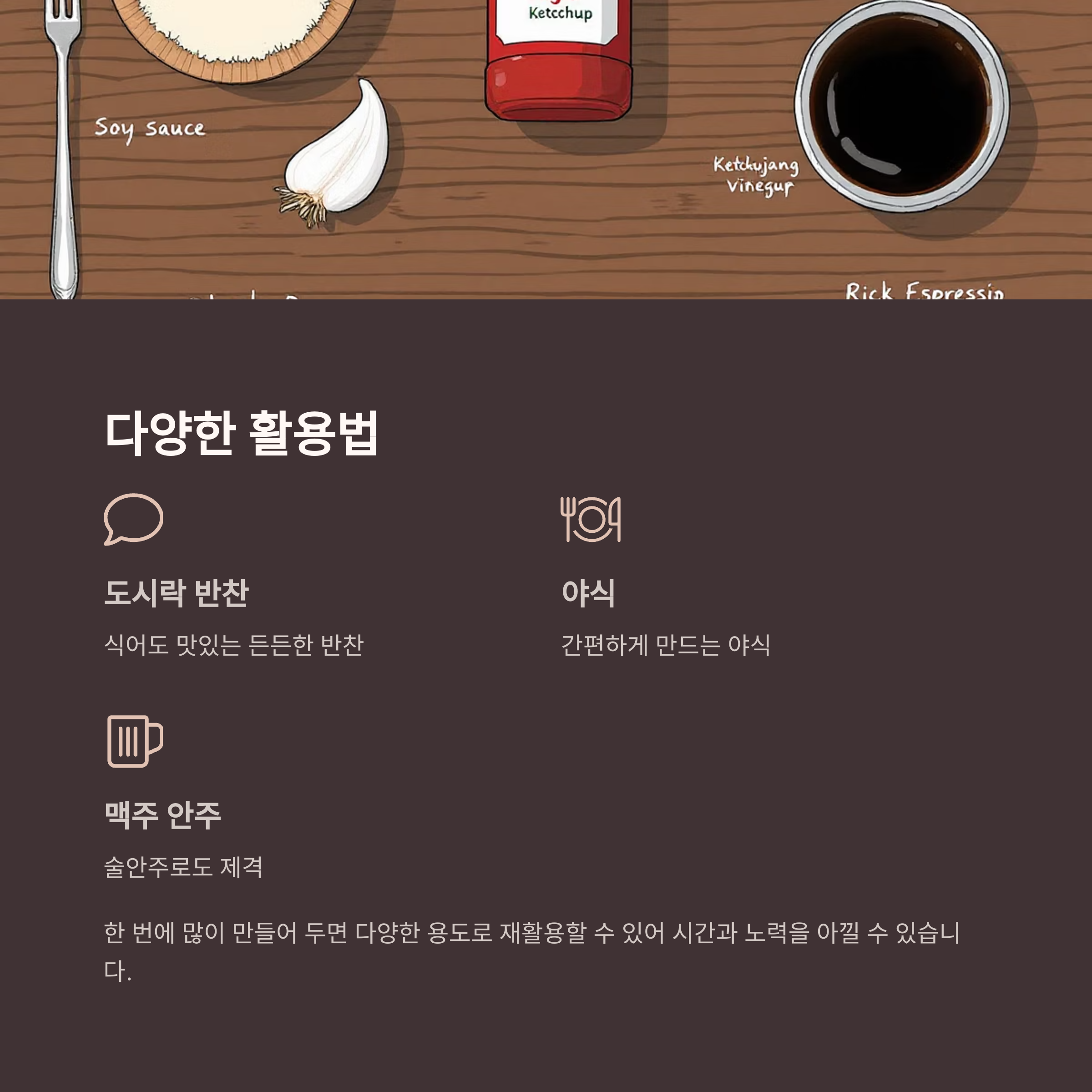 이 요리는 밥반찬뿐만 아니라 도시락 반찬, 야식, 심지어 맥주 안주로도 제격입니다.