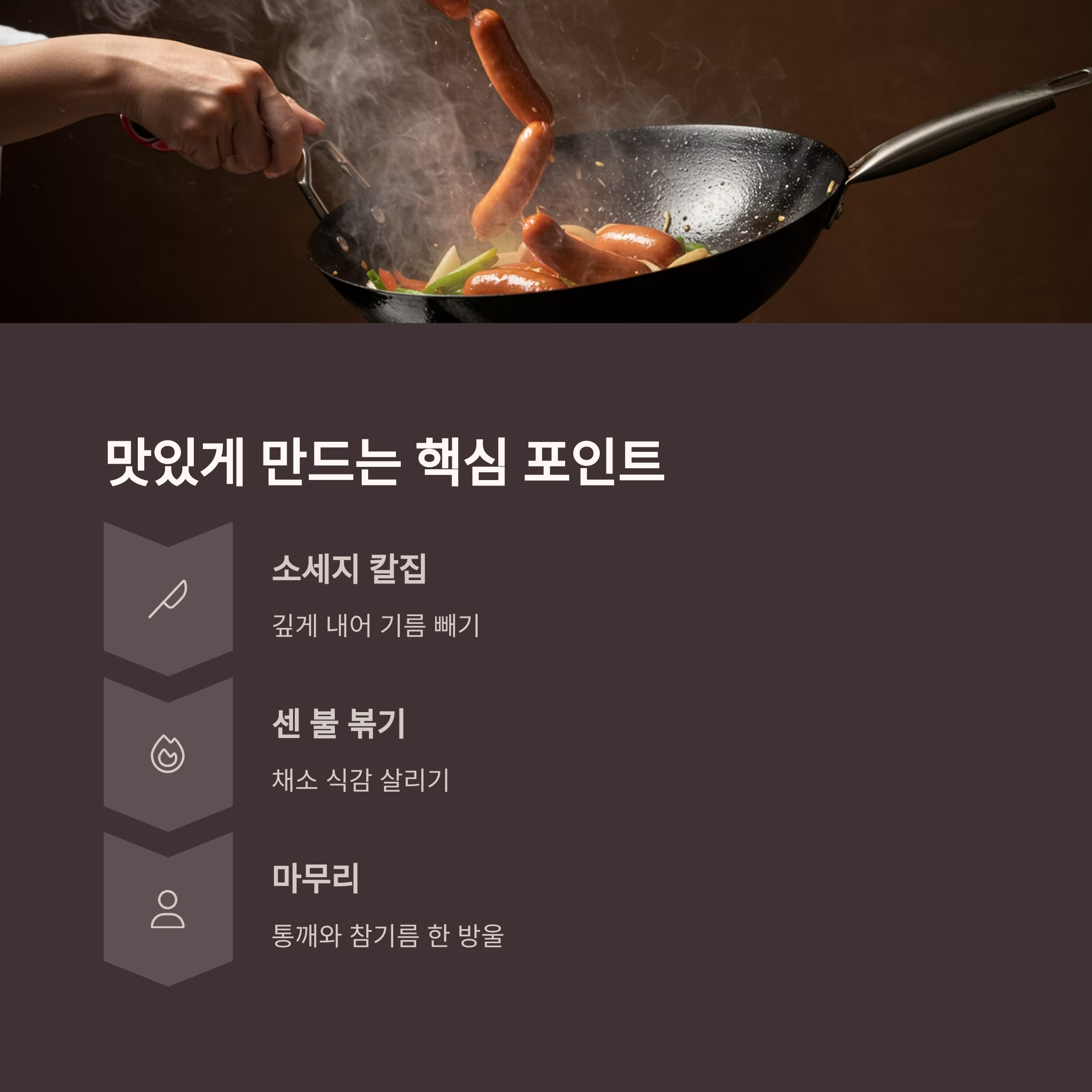 소세지는 칼집을 깊게 내고 먼저 익히면 기름이 빠져 더 담백한 맛을 냅니다.