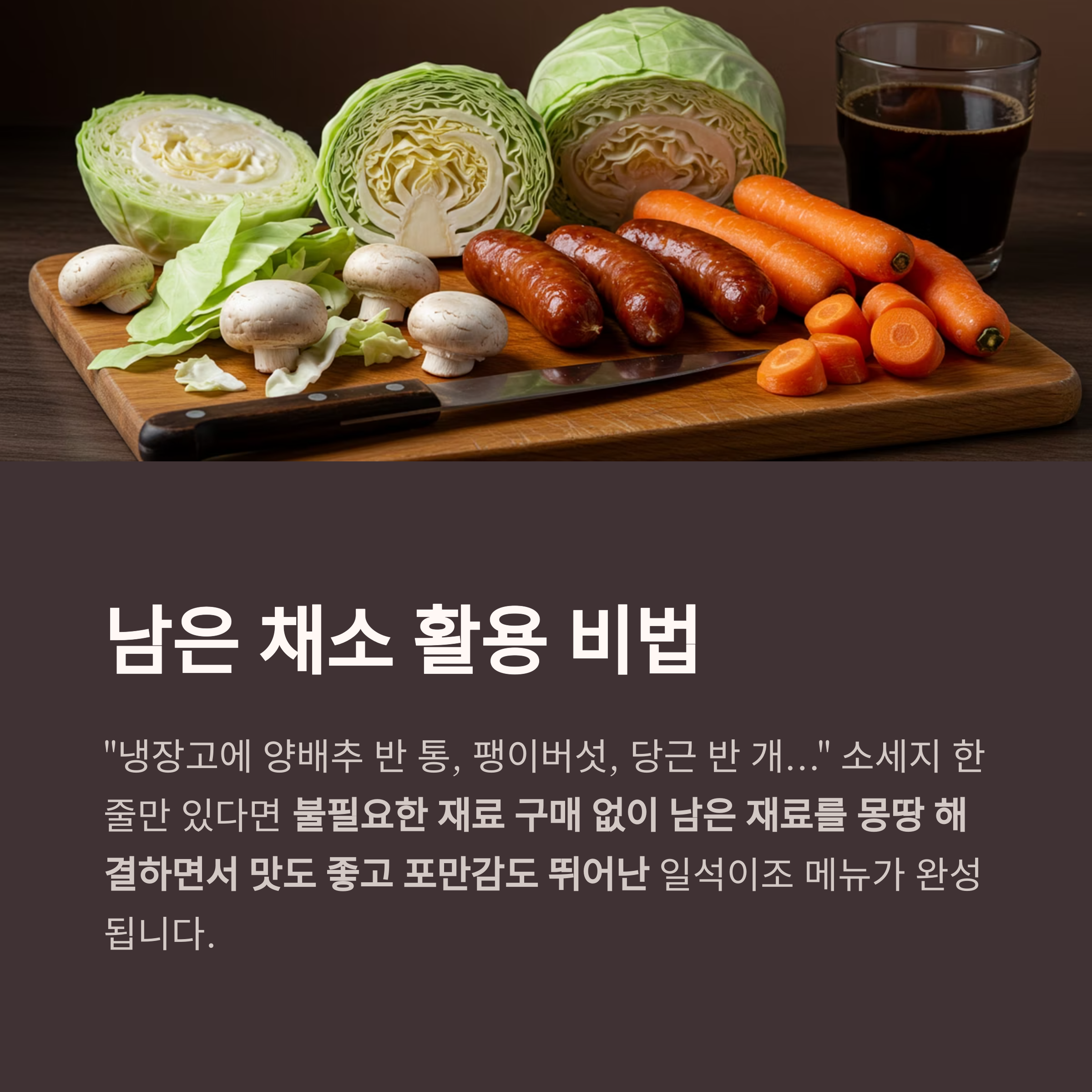 | 남은 채소 | 양배추, 버섯, 대파 | 색감 조화 | 마지막 투입 | 고소한 마무리 |