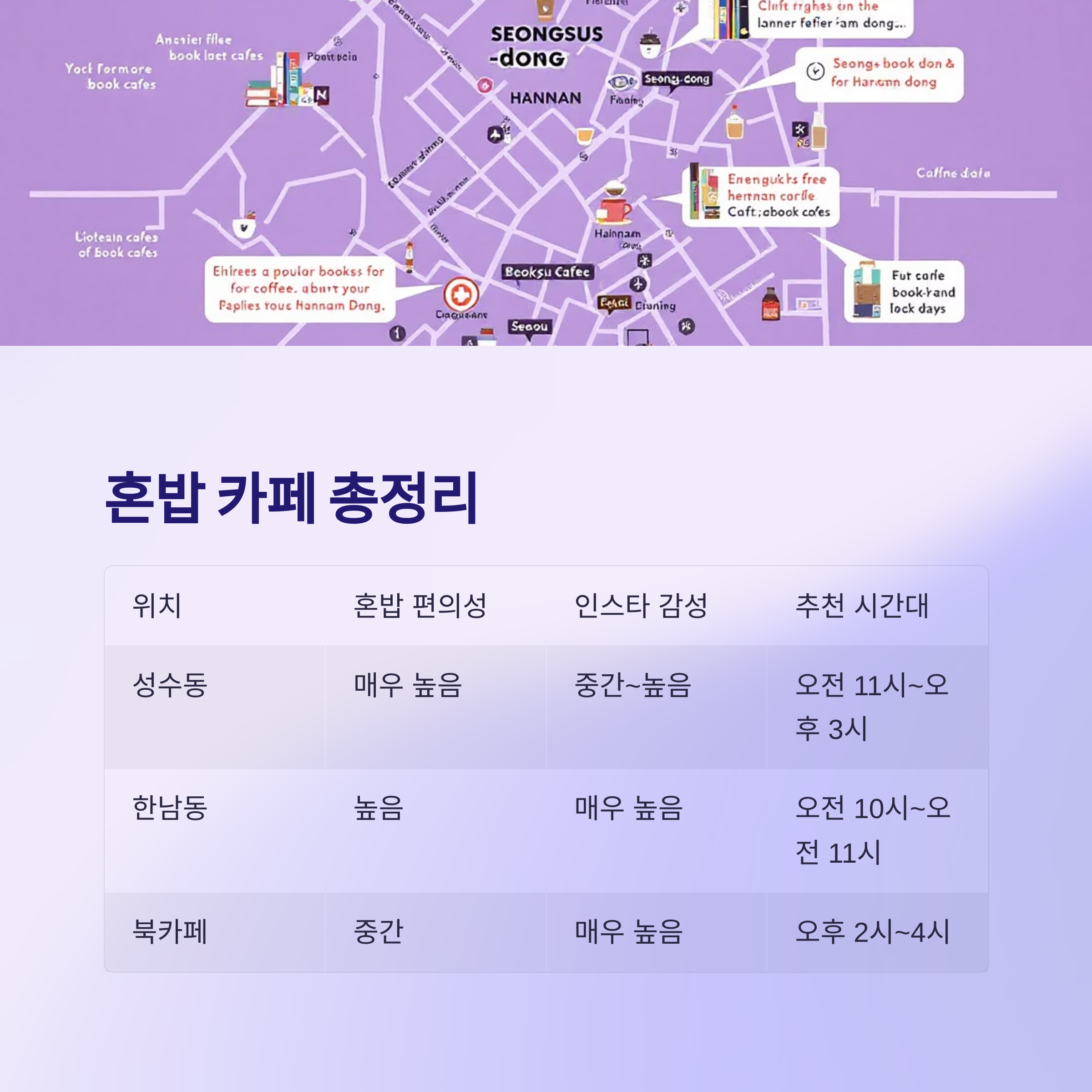 | 성수동 | 매우 높음 | 중간~높음 | 오전 11시~오후 3시 |
