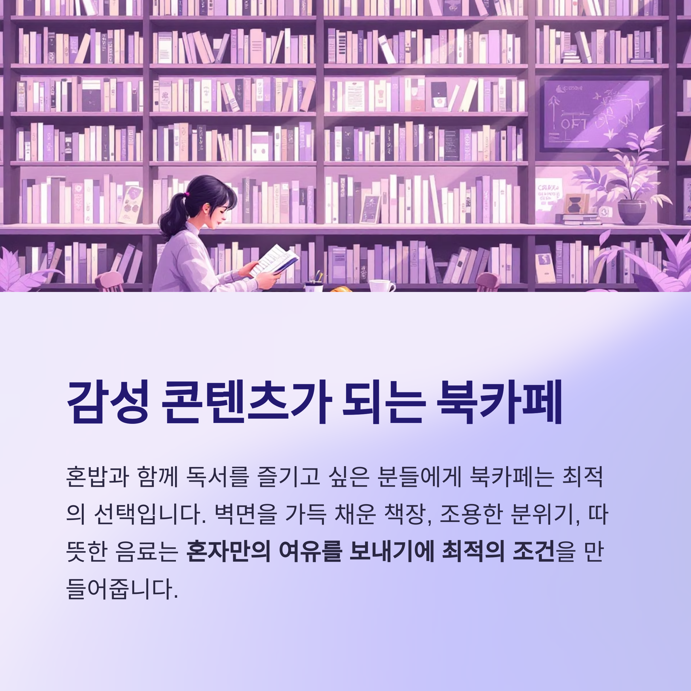 혼밥과 함께 독서를 즐기고 싶은 분들은 북카페가 제격입니다.