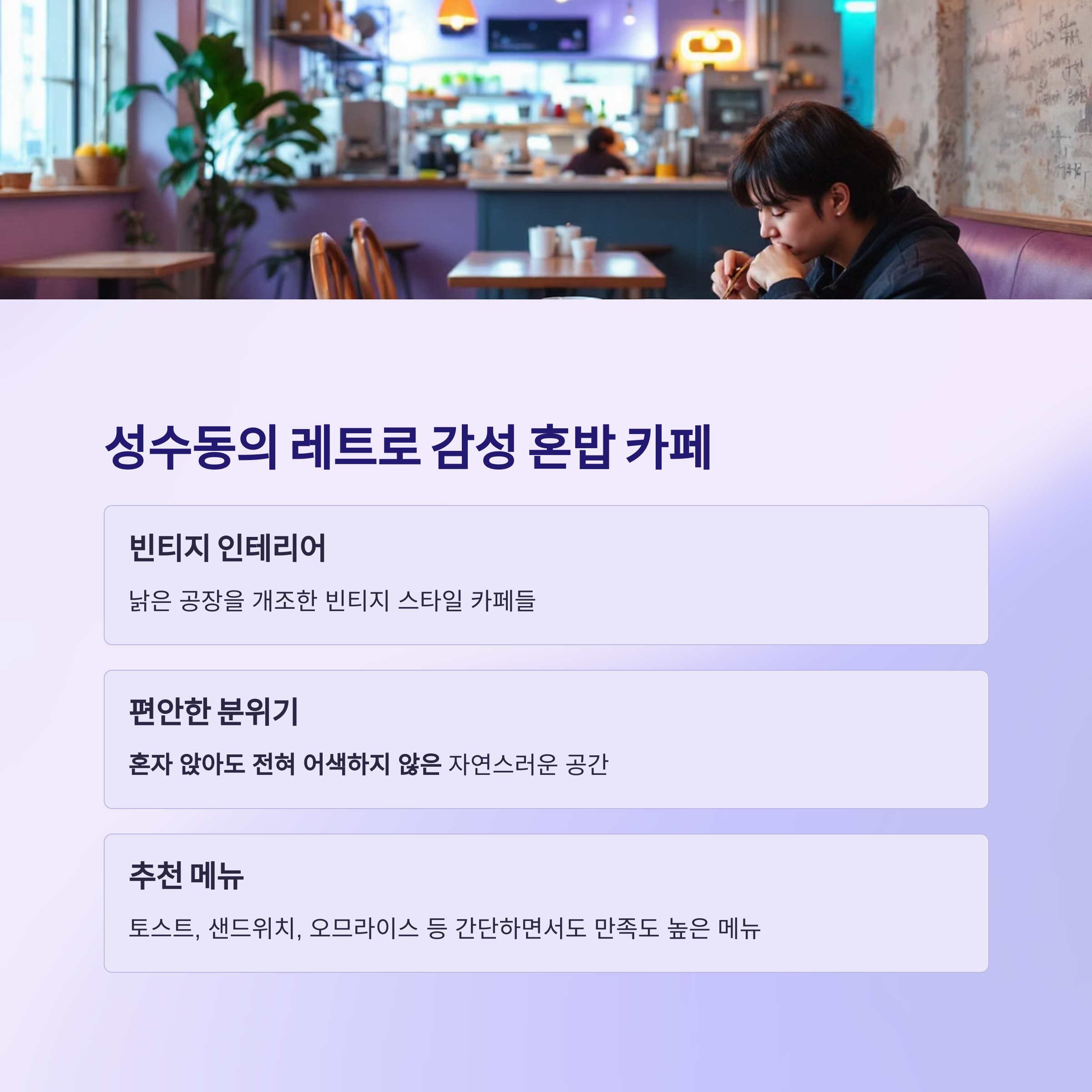 성수동은 서울 혼밥 성지 중 하나로, 감성과 트렌디함을 모두 갖춘 곳입니다.