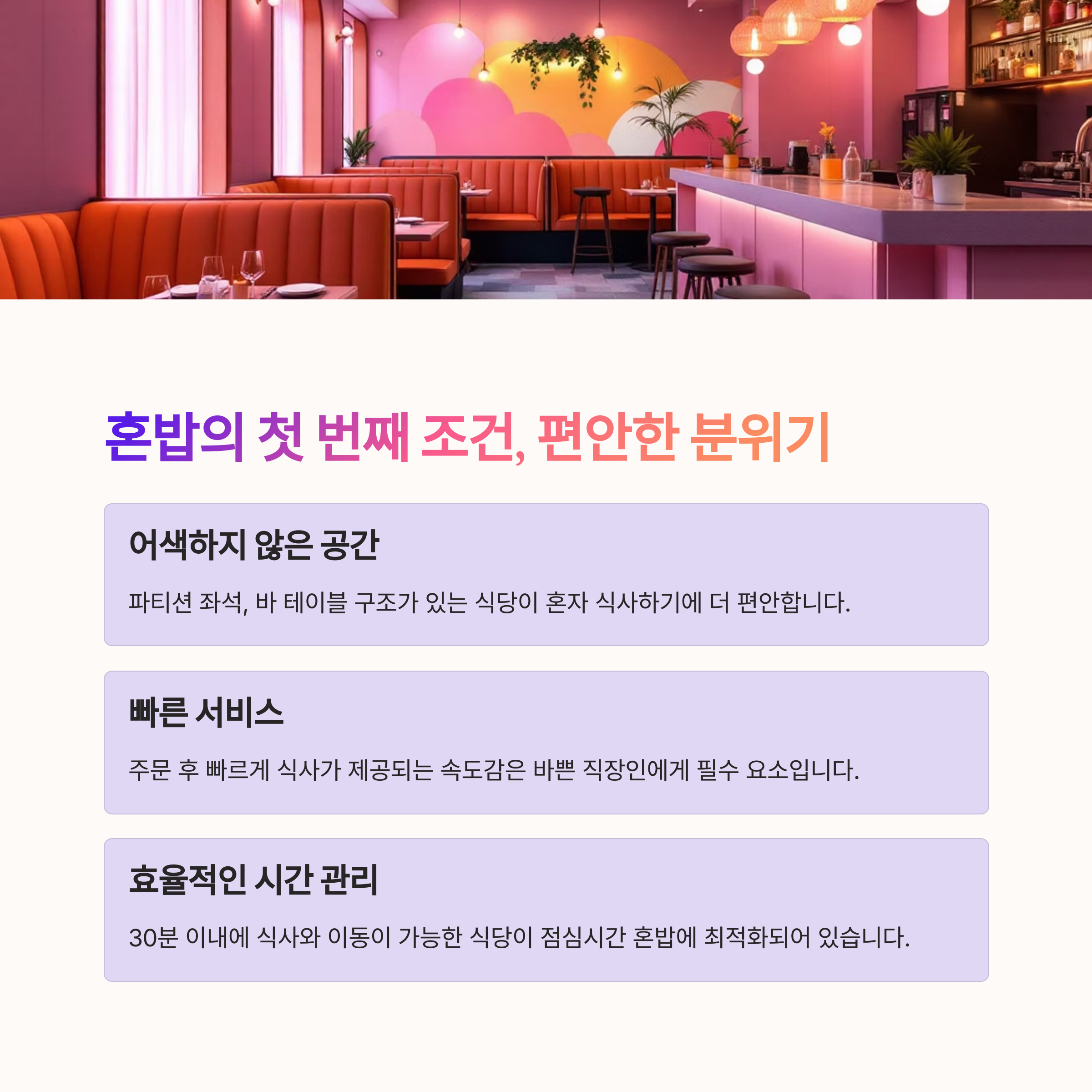 "혼밥하기 좋은 식당의 특징은?"