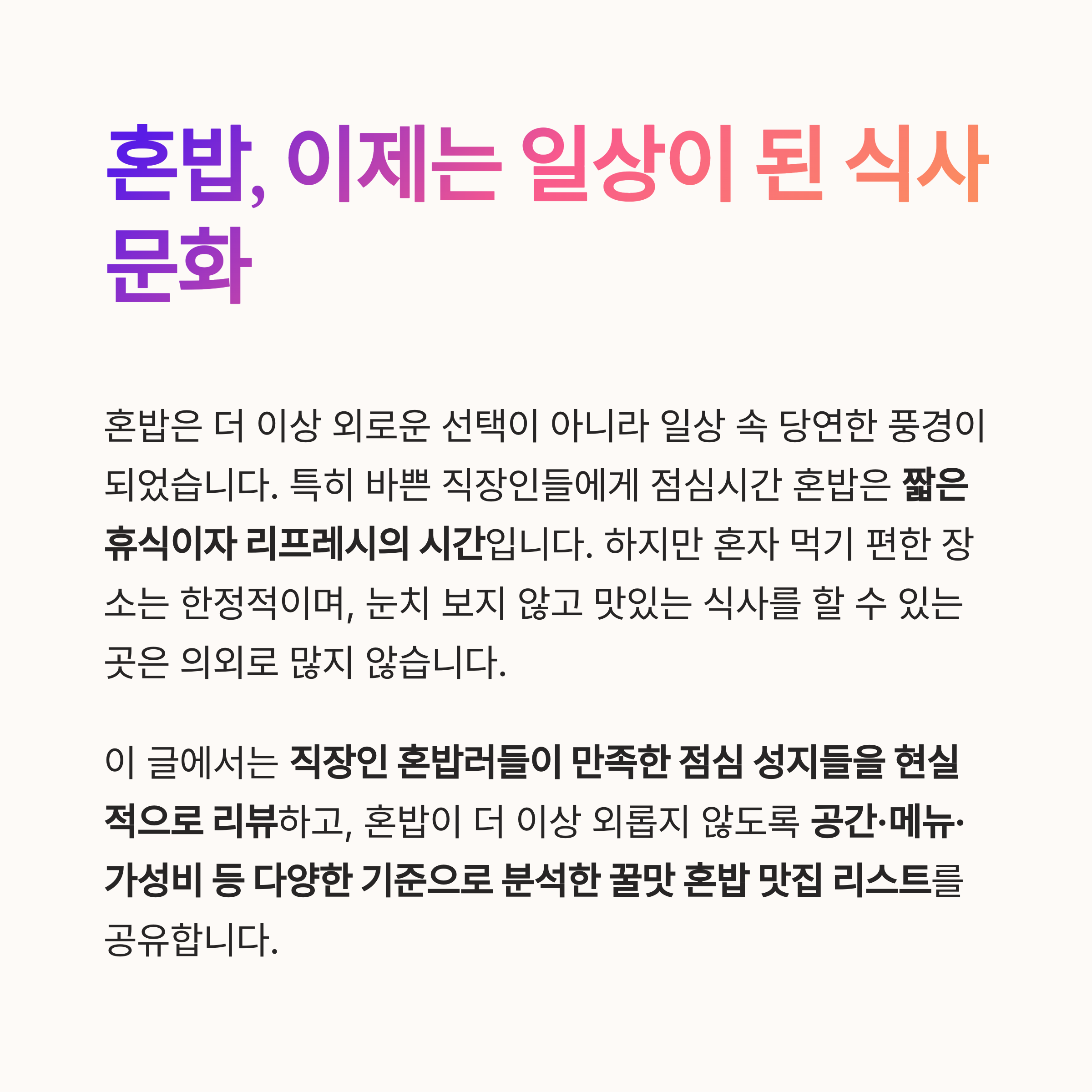 혼밥은 더 이상 외로운 선택이 아니라 일상 속 당연한 풍경이 되었습니다.