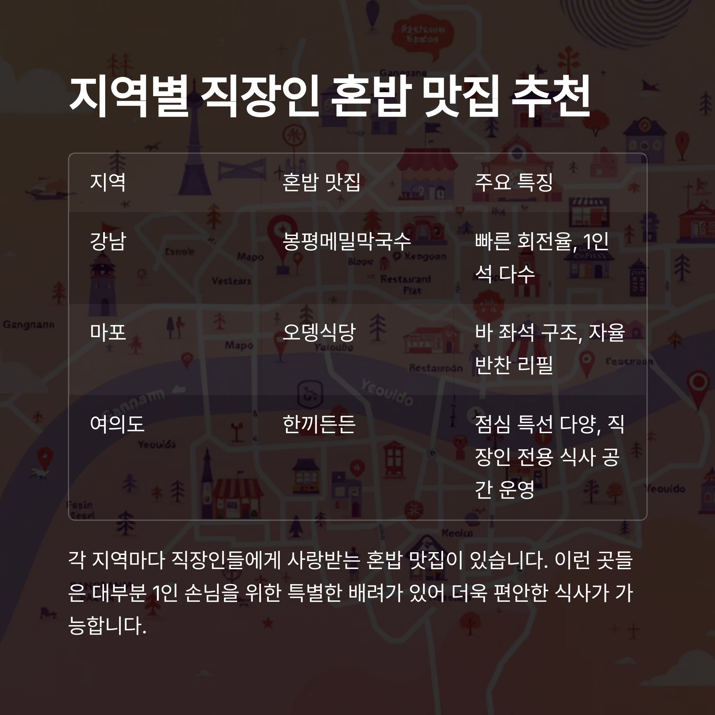 지역별 직장인 혼밥 인기 식당 맵 추천 (가상의 예)
