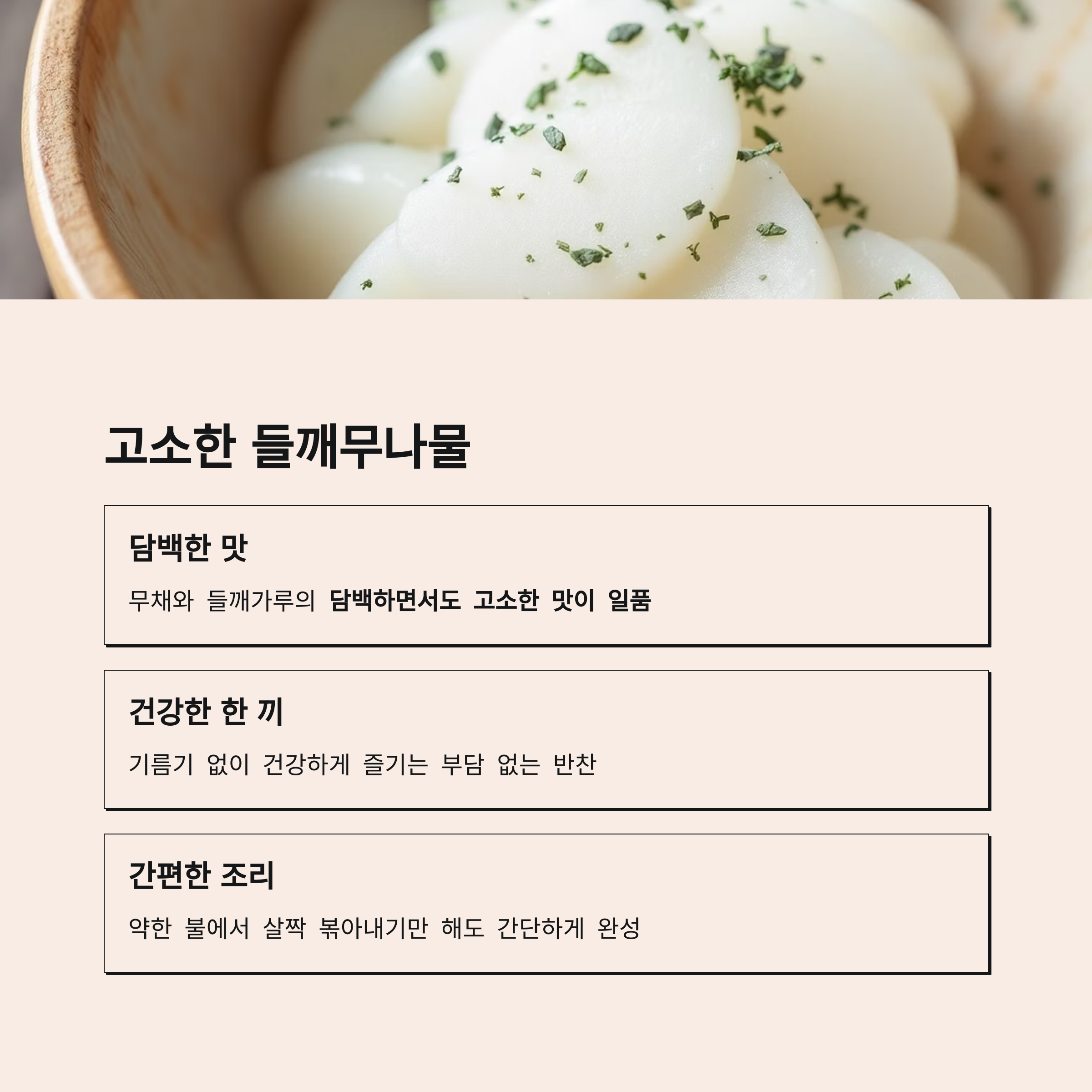 무채에 들깨가루를 넣어 만든 들깨무나물은 담백하면서도 고소한 맛이 일품입니다.