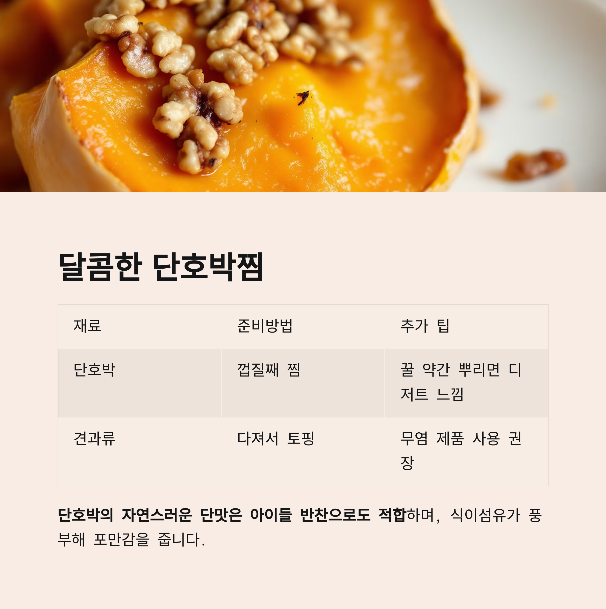 단호박의 자연스러운 단맛은 아이들 반찬으로도 적합하며, 식이섬유도 풍부해 포만감을 줍니다.
