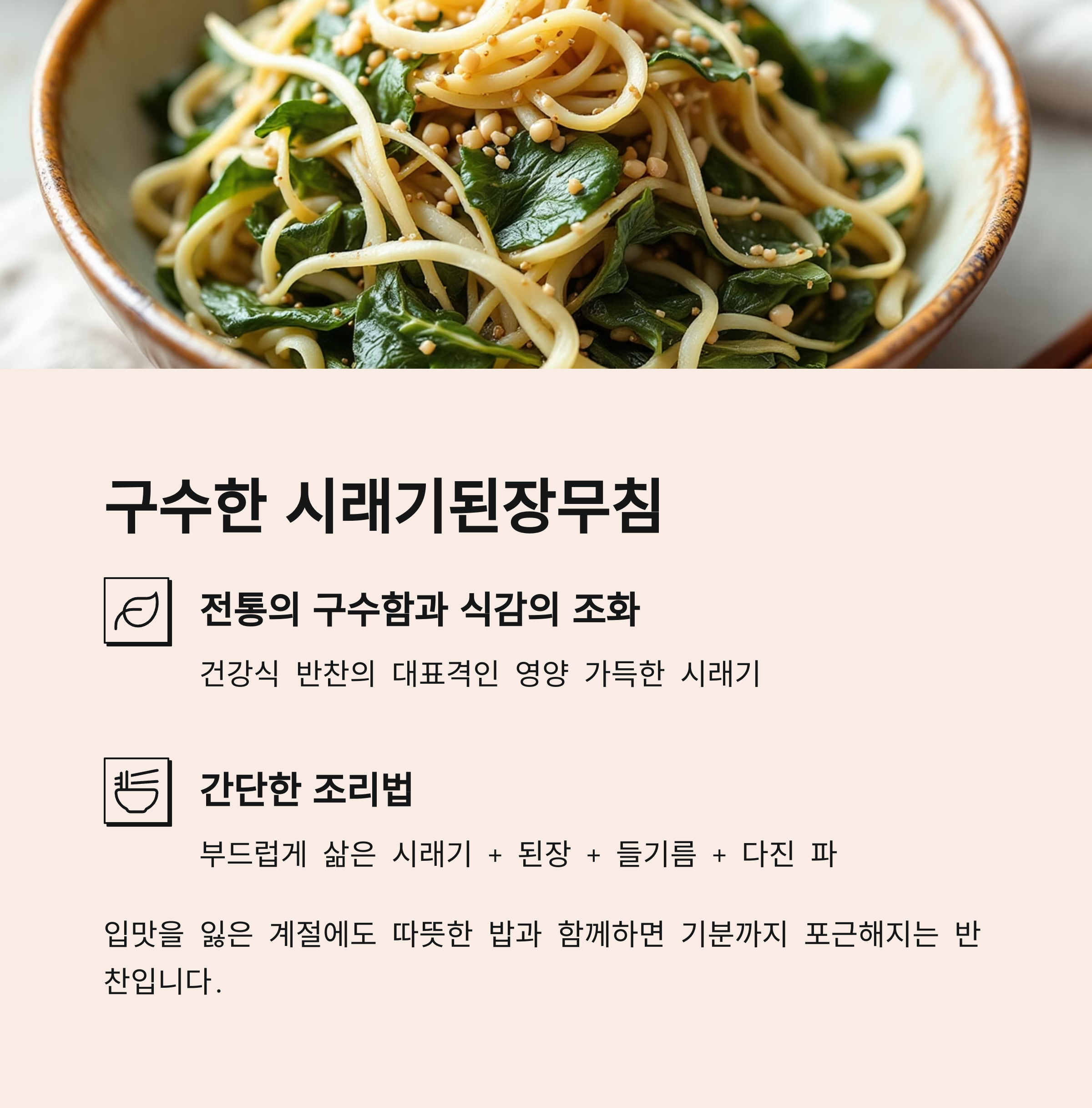 건강식 반찬의 대표 격인 시래기된장무침은 전통의 구수함과 식감의 조화가 뛰어납니다.
