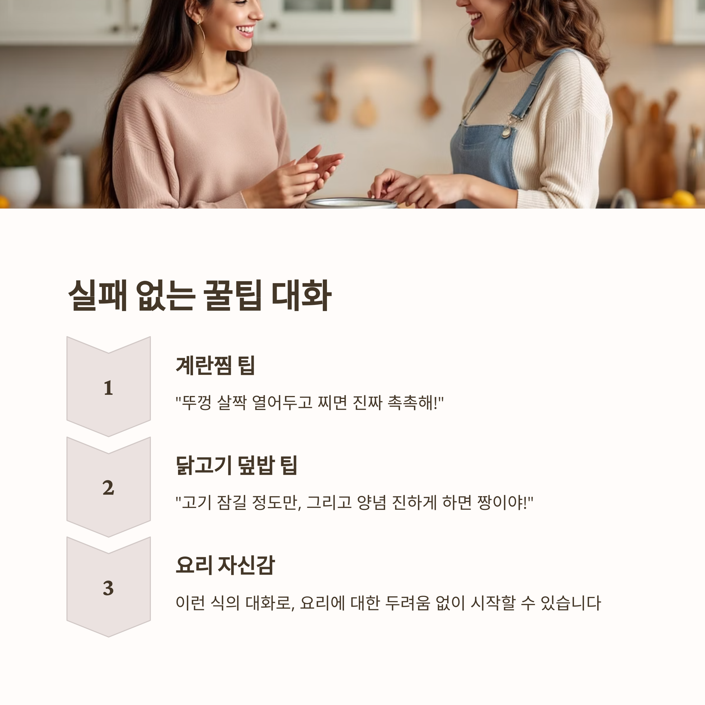 이런 식의 대화로, 요리에 대한 두려움 없이 시작할 수 있습니다.