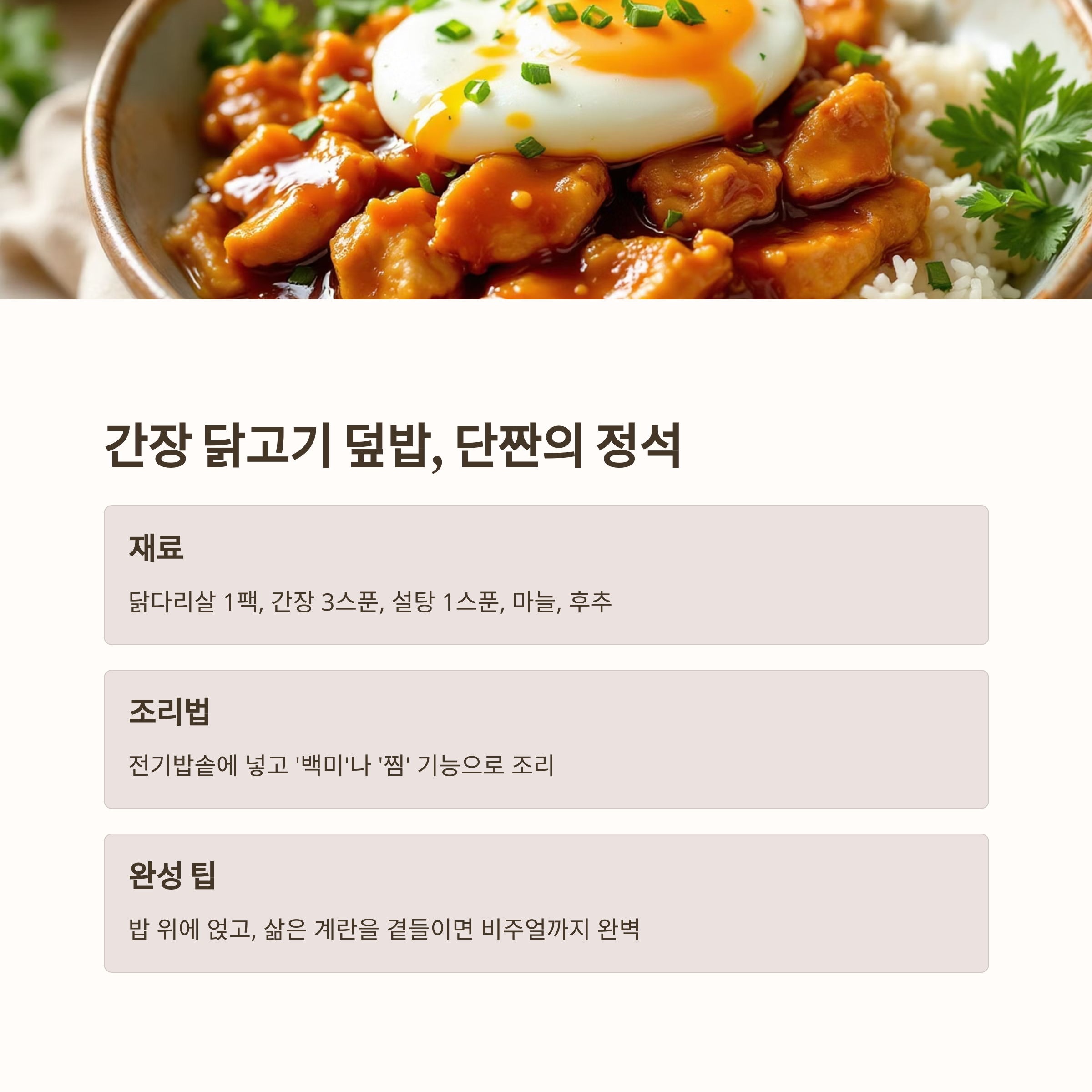 | 전기밥솥으로 완성하는 단짠 간장 닭고기 덮밥 레시피 (1) | 2025.05.17 |