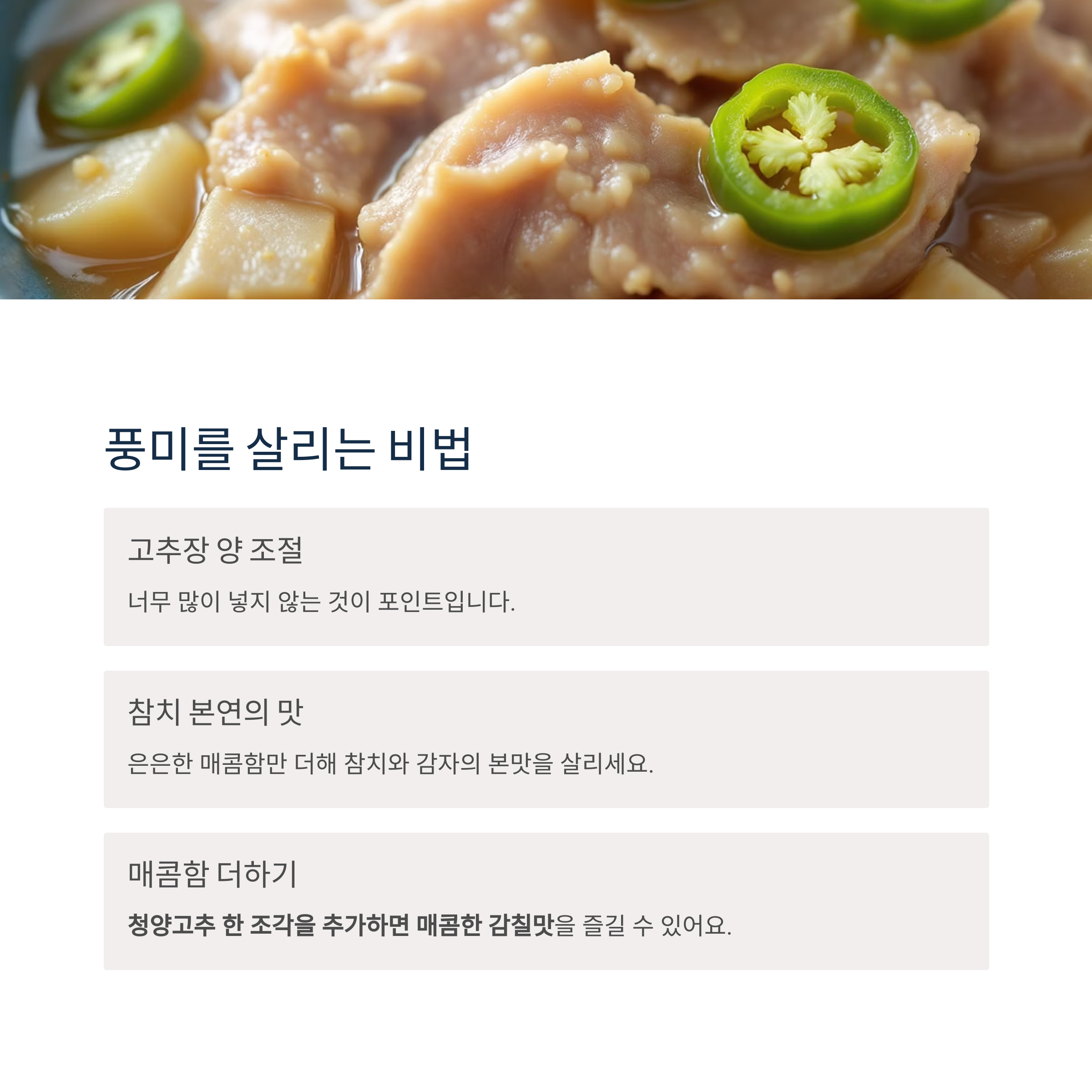 기호에 따라 청양고추 한 조각을 추가하면 매콤한 감칠맛을 더할 수 있습니다.