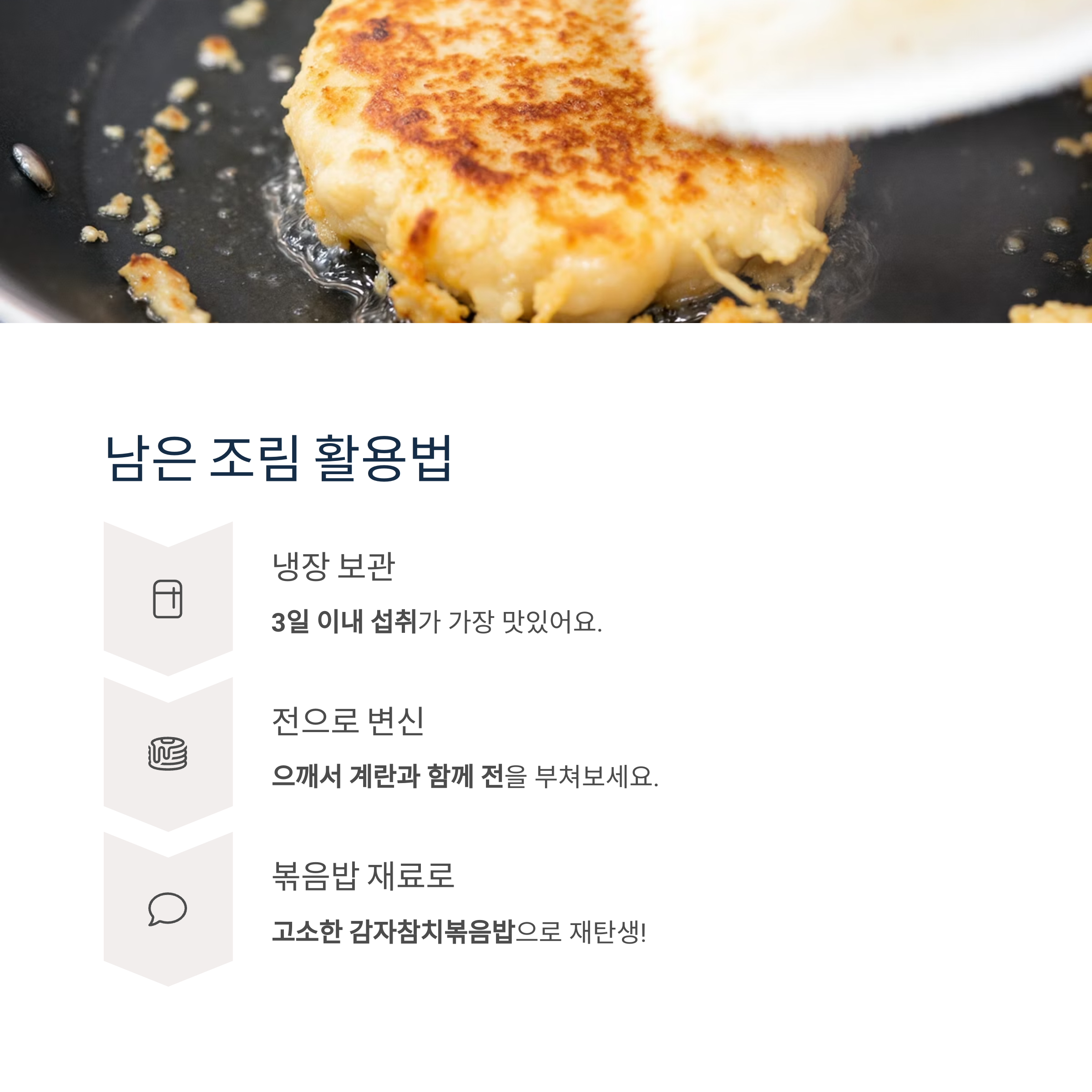 재활용 요리로는 조림을 으깨 계란과 함께 전을 부쳐도 별미로 즐길 수 있습니다.