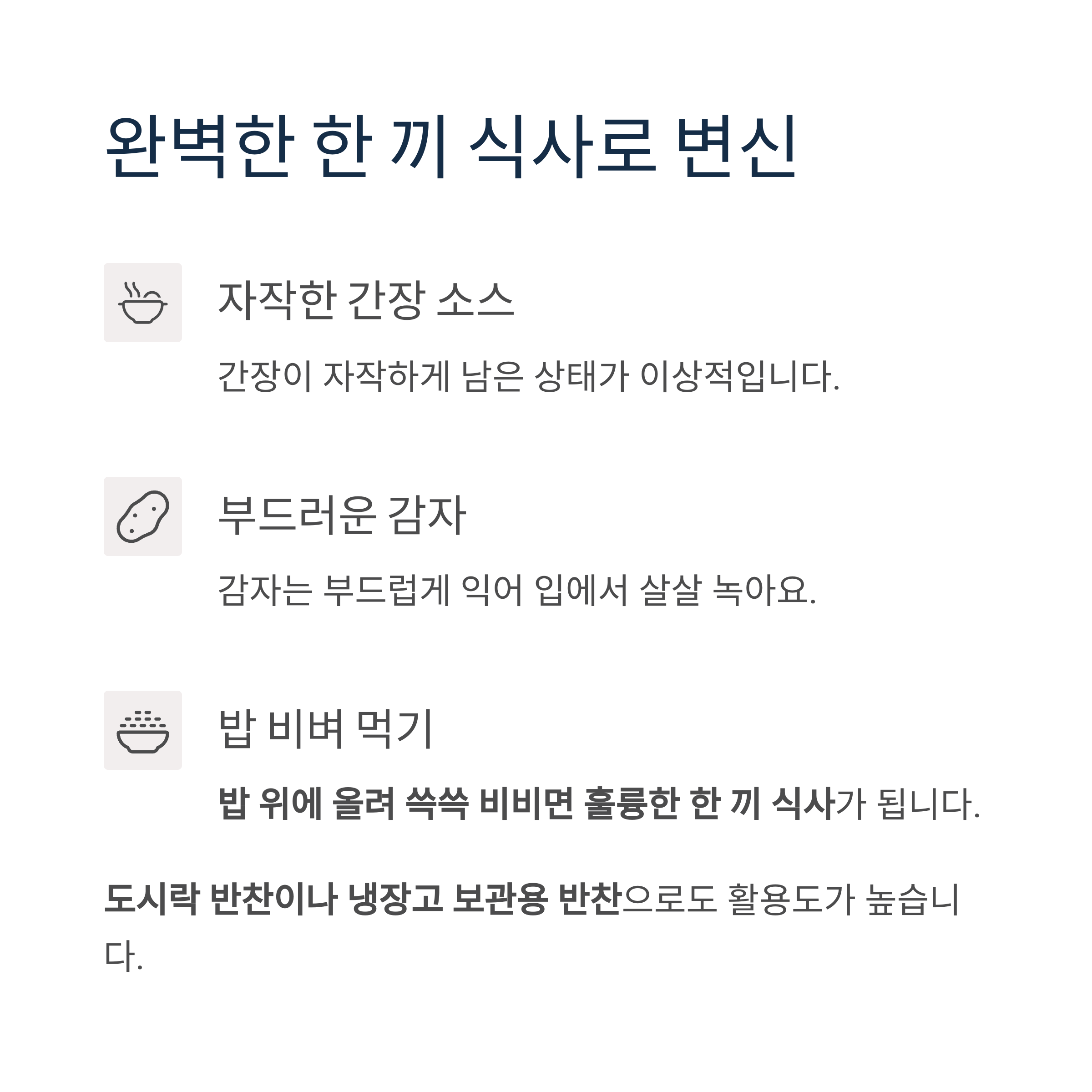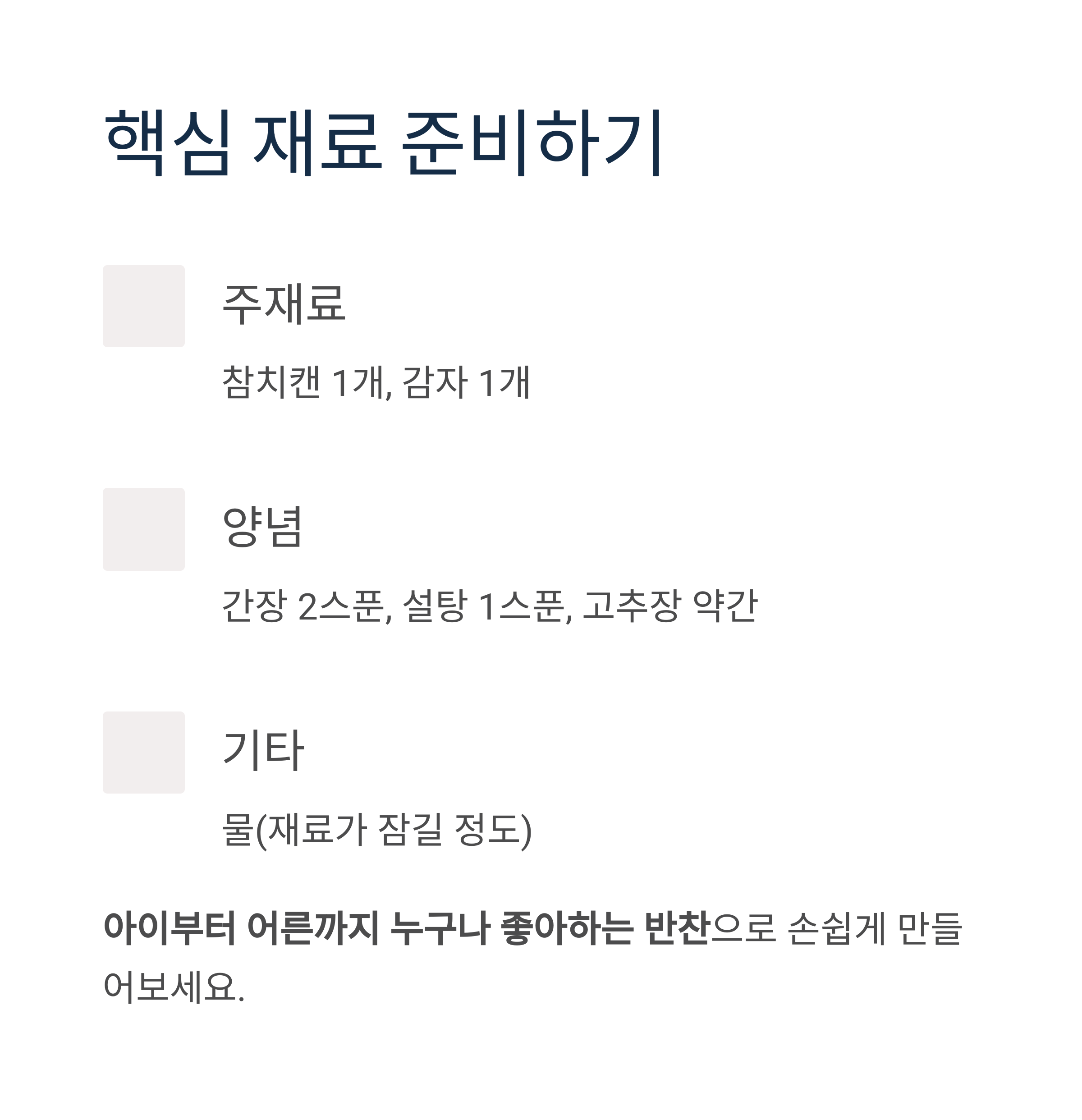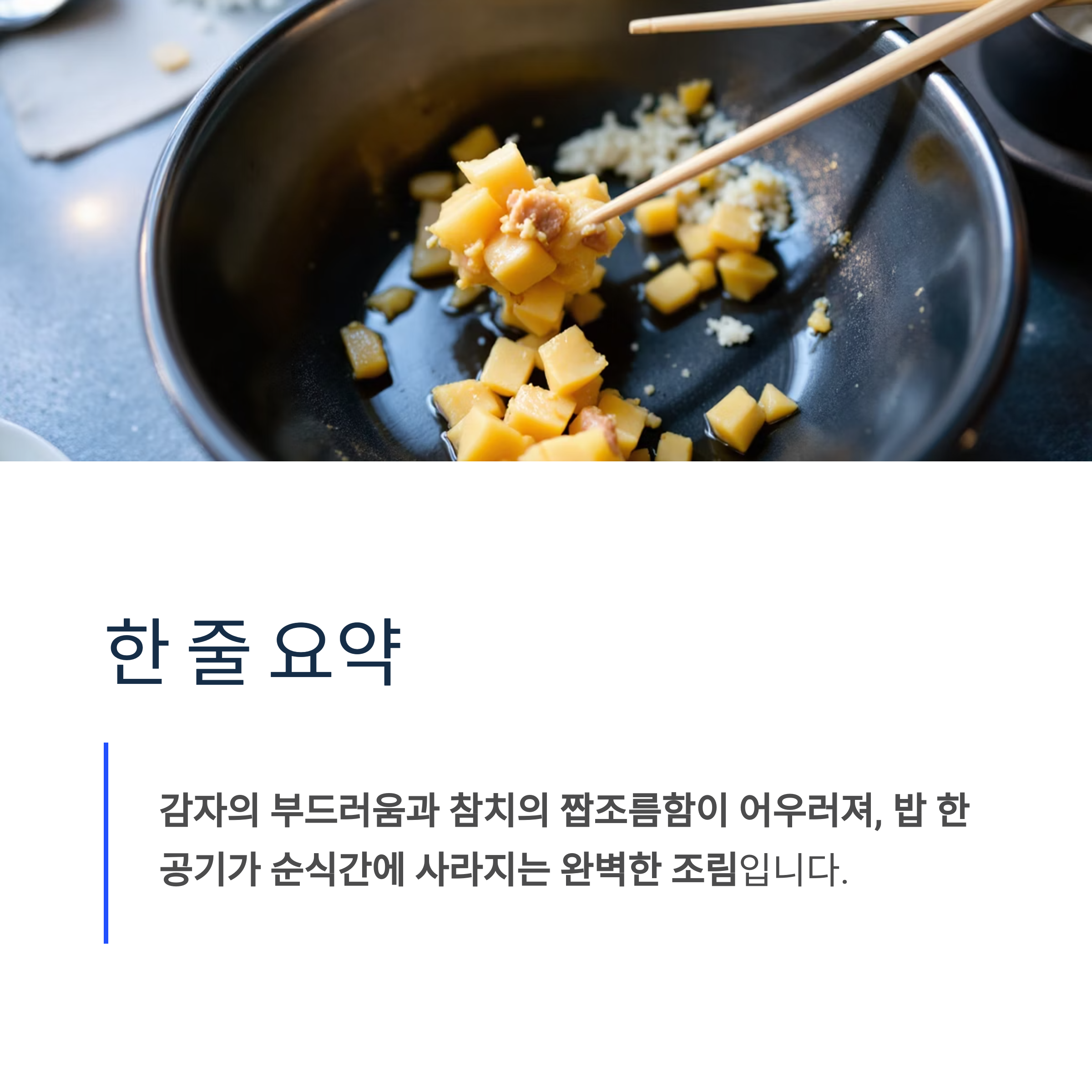 감자의 부드러움과 참치의 짭조름함이 어우러져, 밥 한 공기가 순식간에 사라지는 완벽한 조림입니다.