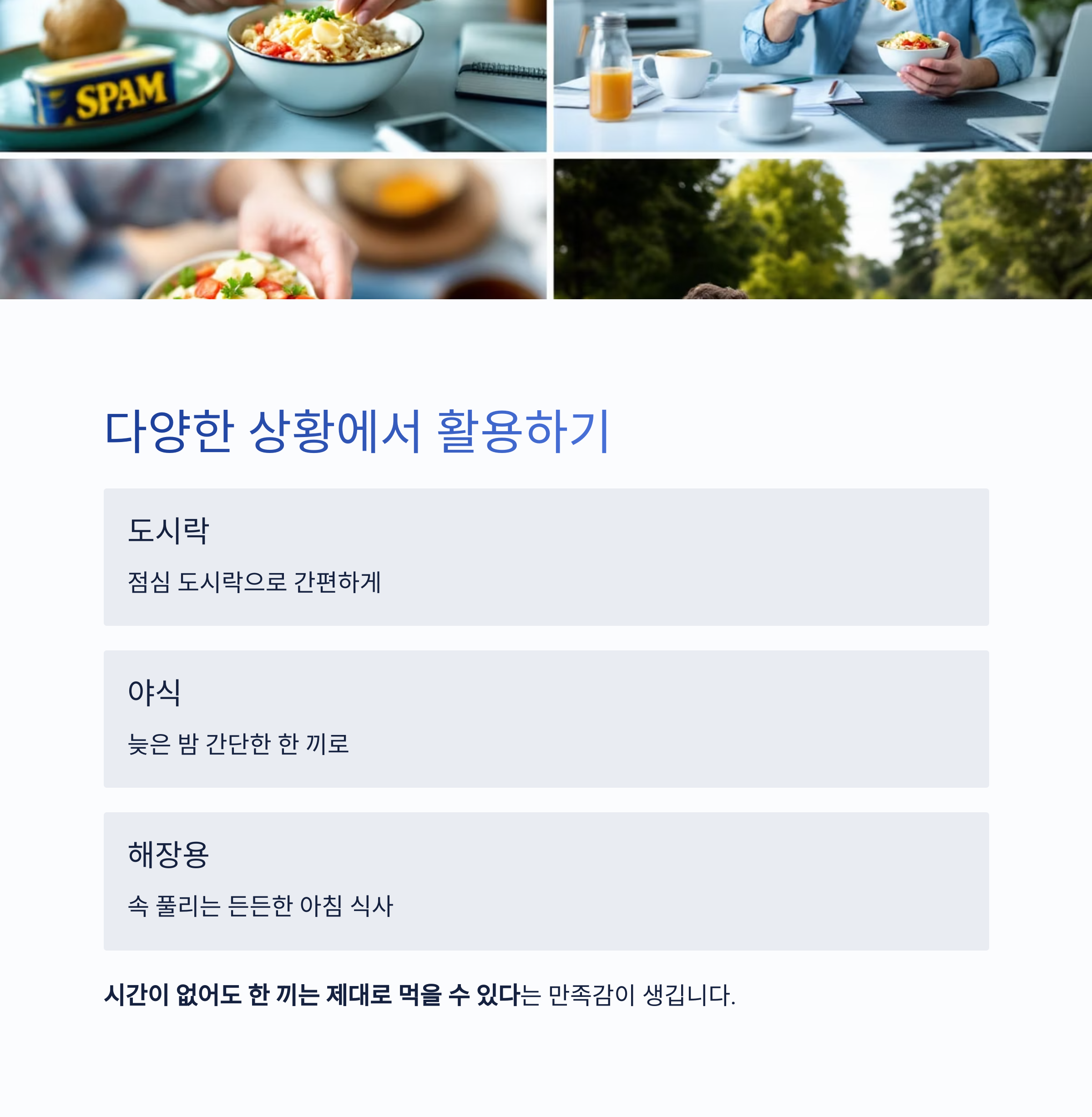 | 스팸 굽기 | 노릇하게 겉면을 익혀야 풍미 극대화 |