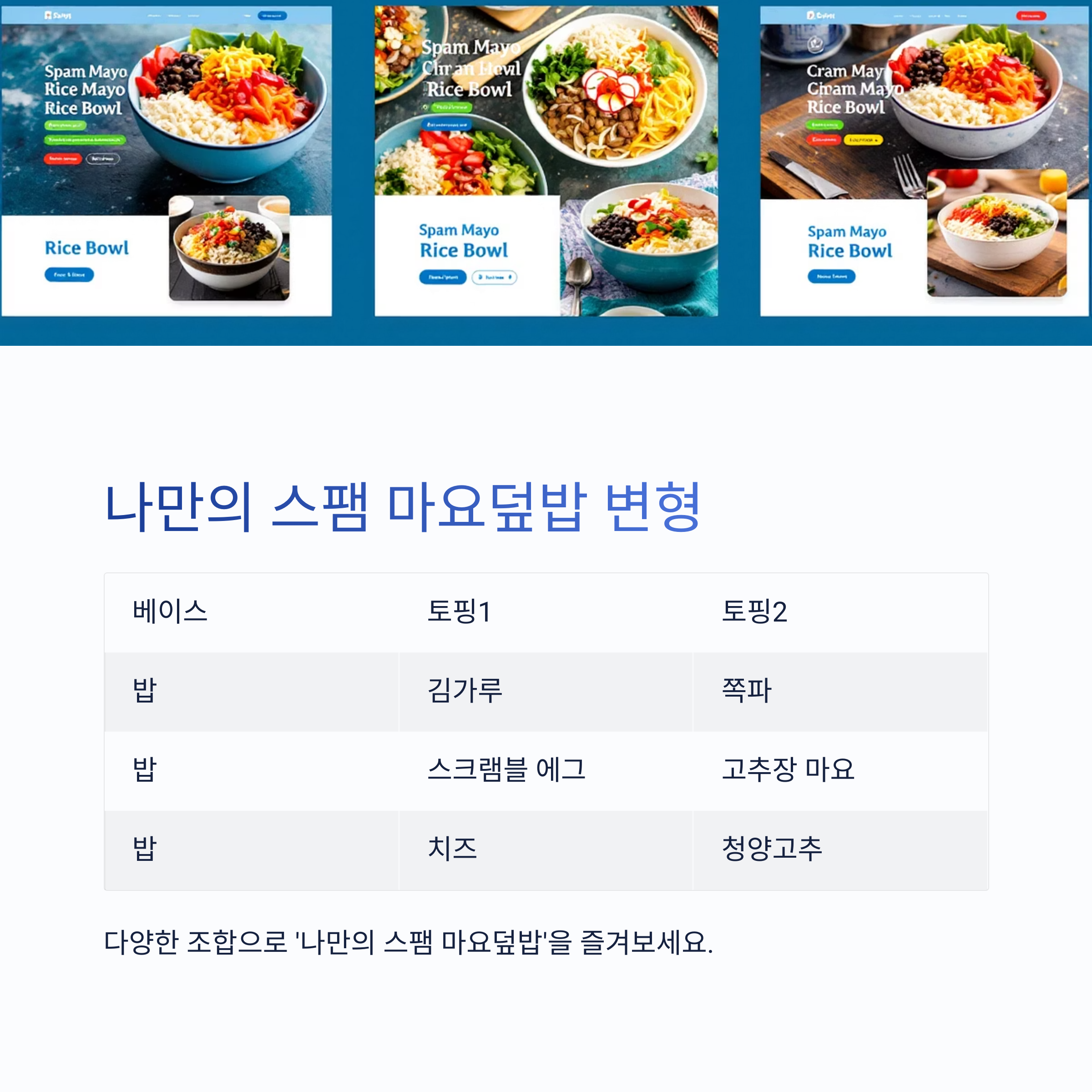 다양한 조합으로 '나만의 스팸 마요덮밥'을 즐겨보세요.