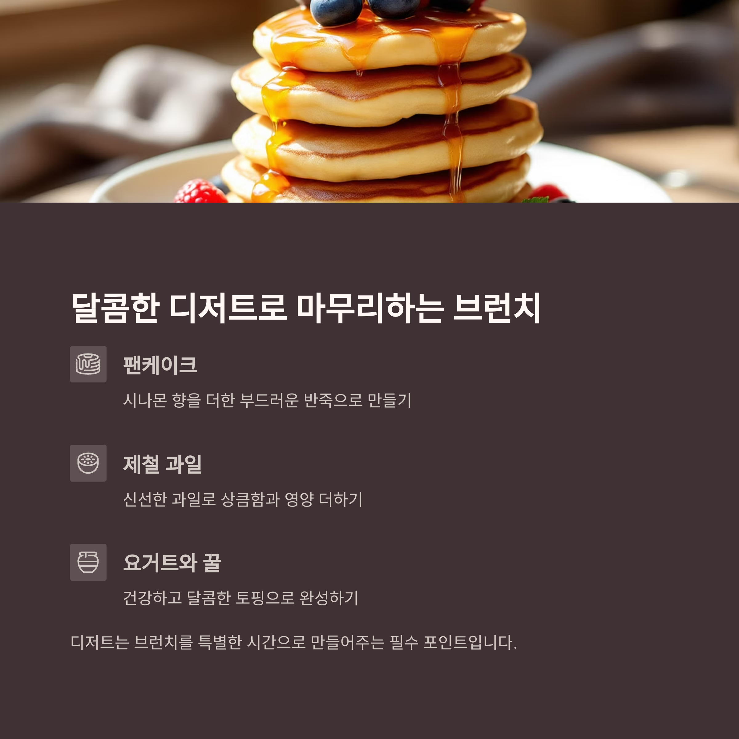 디저트는 브런치를 특별한 시간으로 만들어주는 필수 포인트입니다.