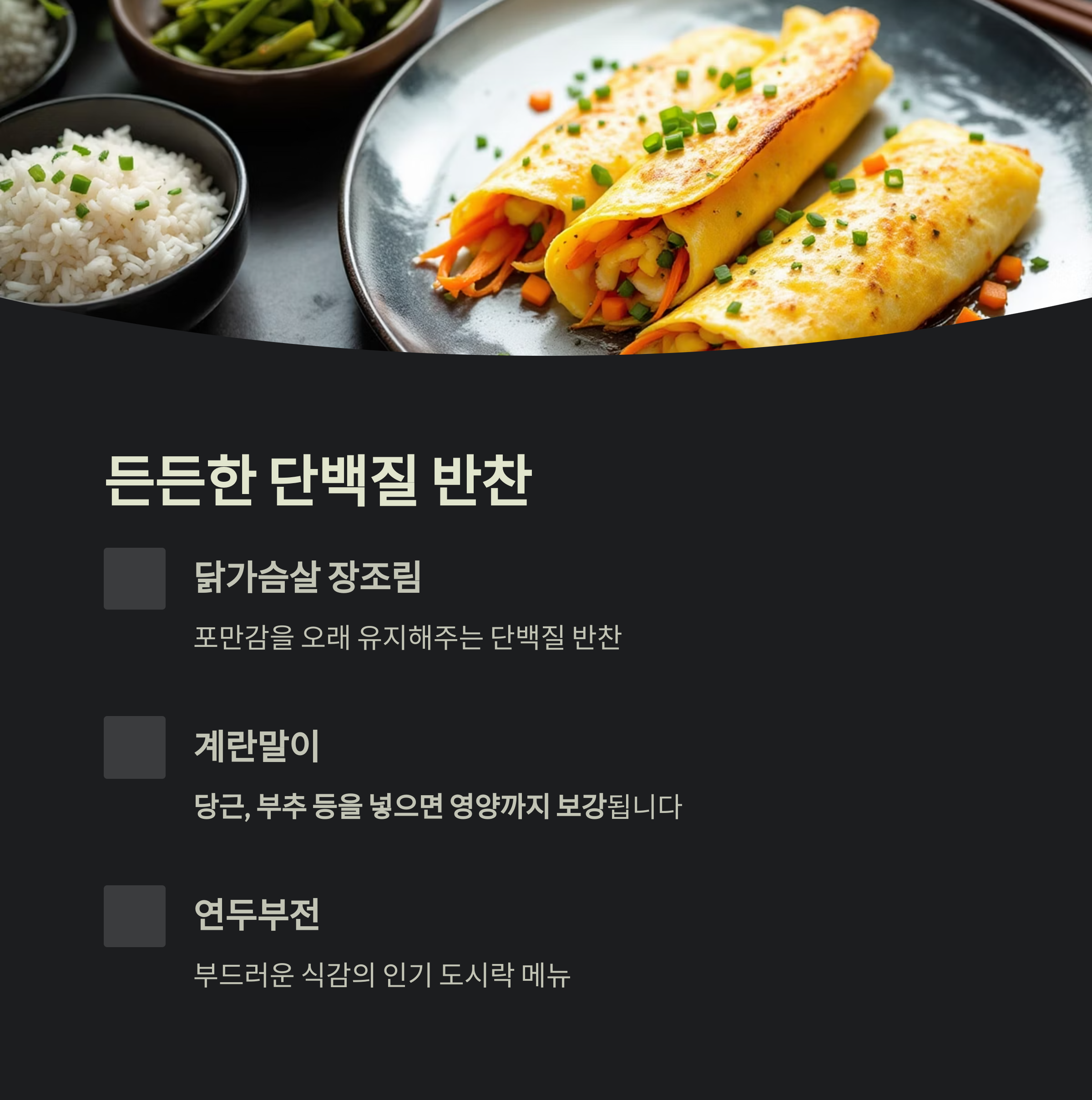 닭가슴살 장조림, 계란말이, 연두부전은