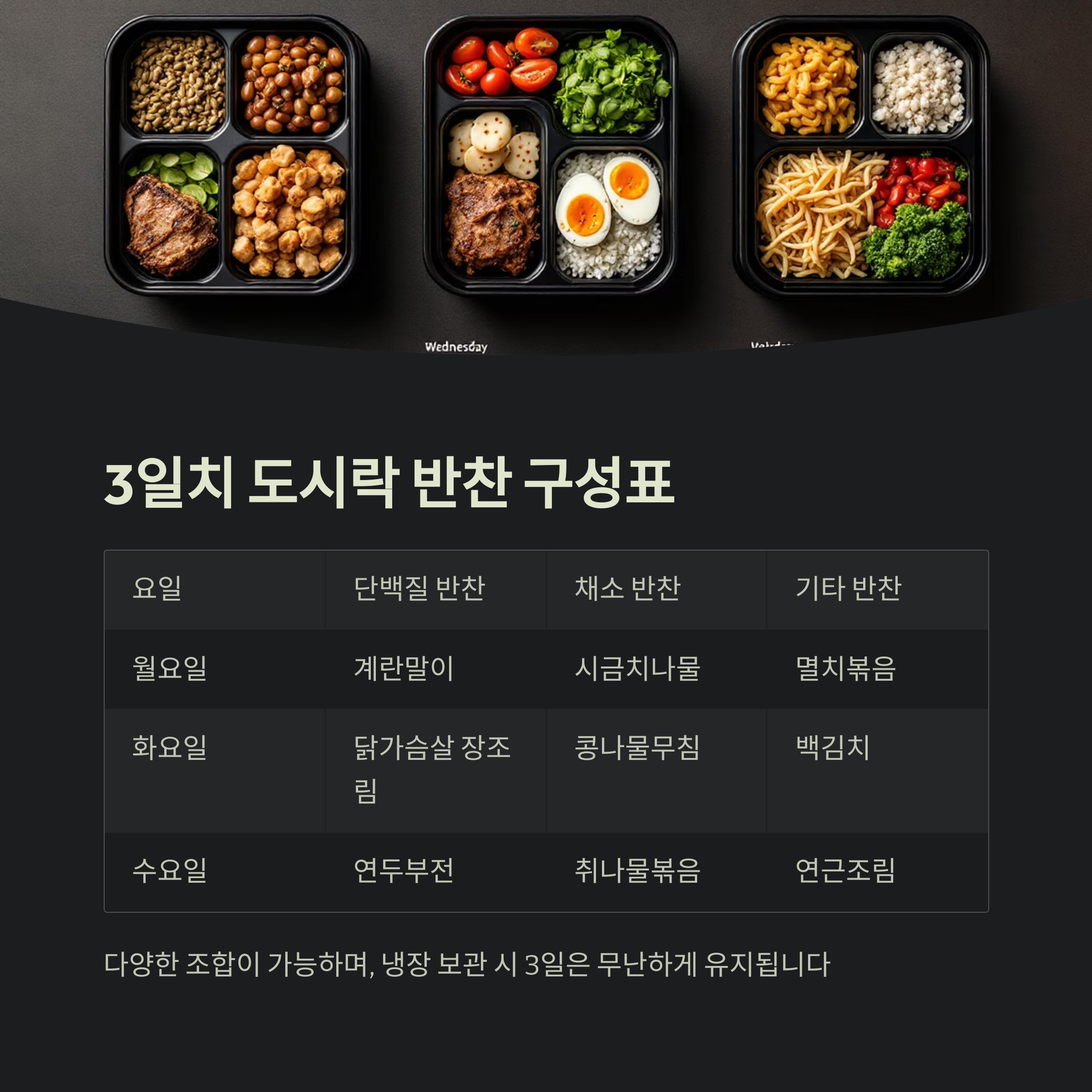 반찬 구성 예시: 3일치 도시락 메뉴