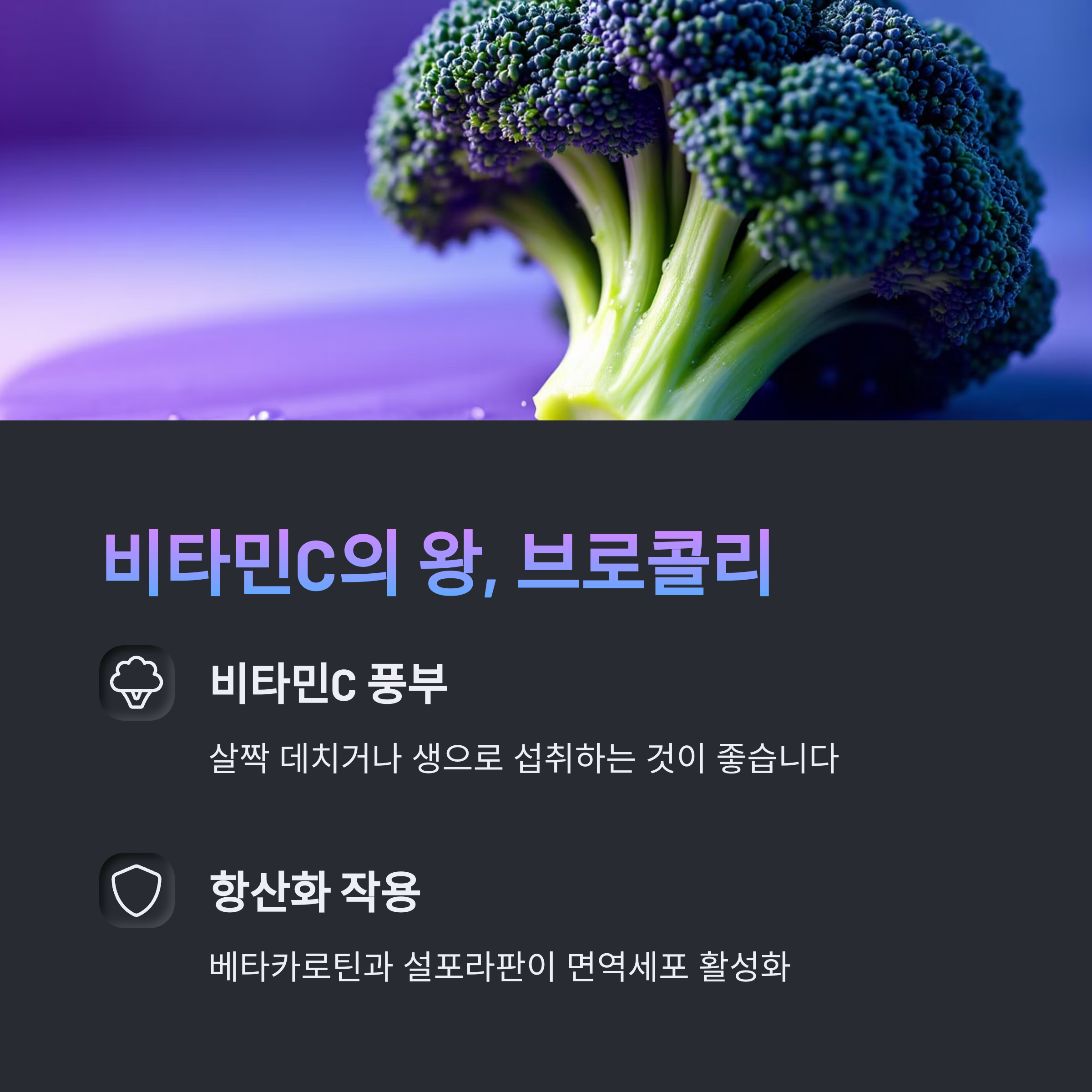 | 브로콜리 | 비타민C, 설포라판 | 면역세포 활성화 |